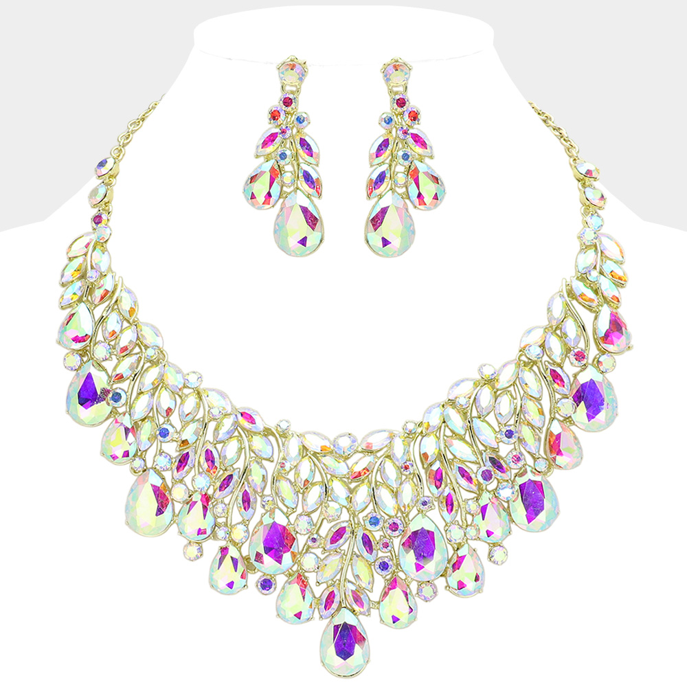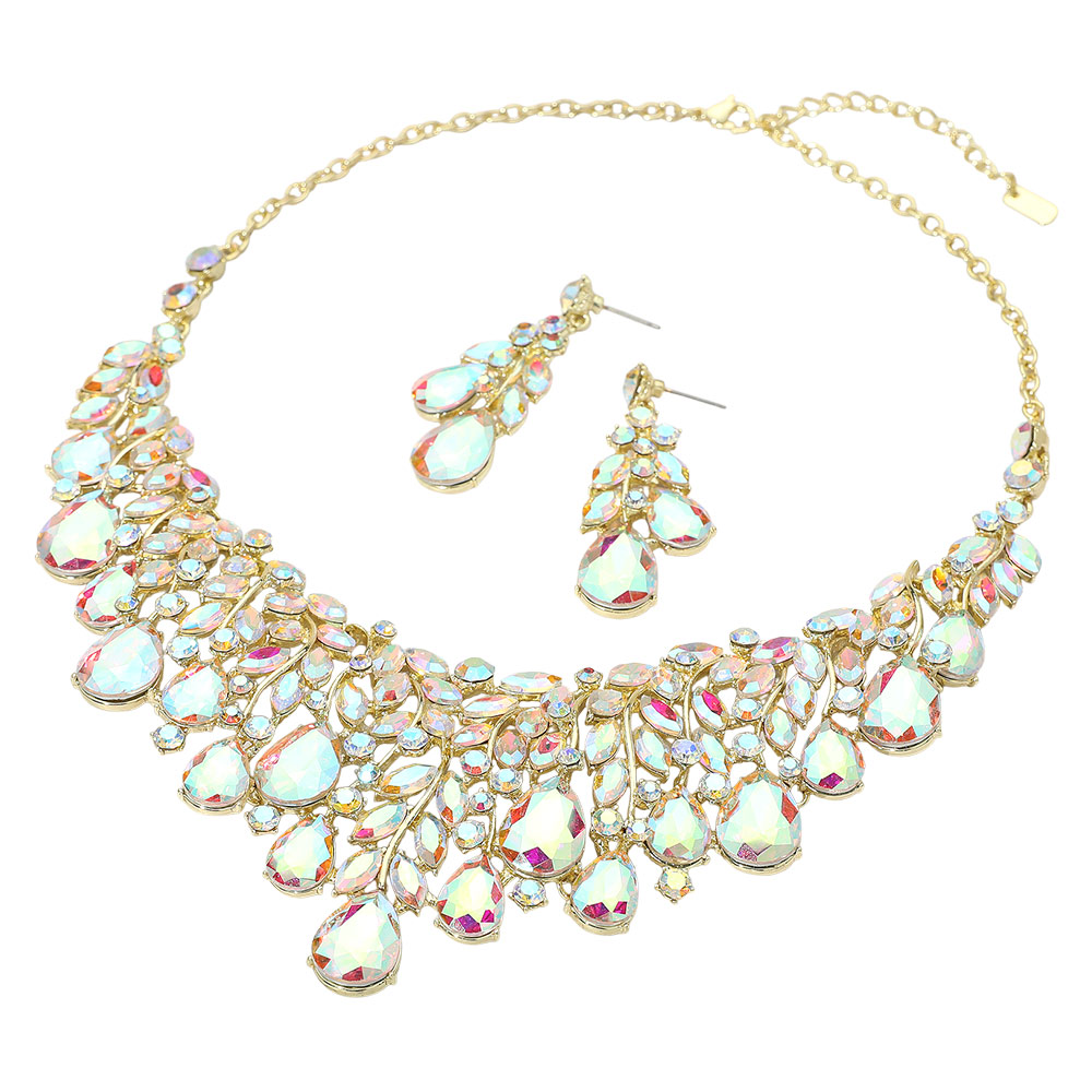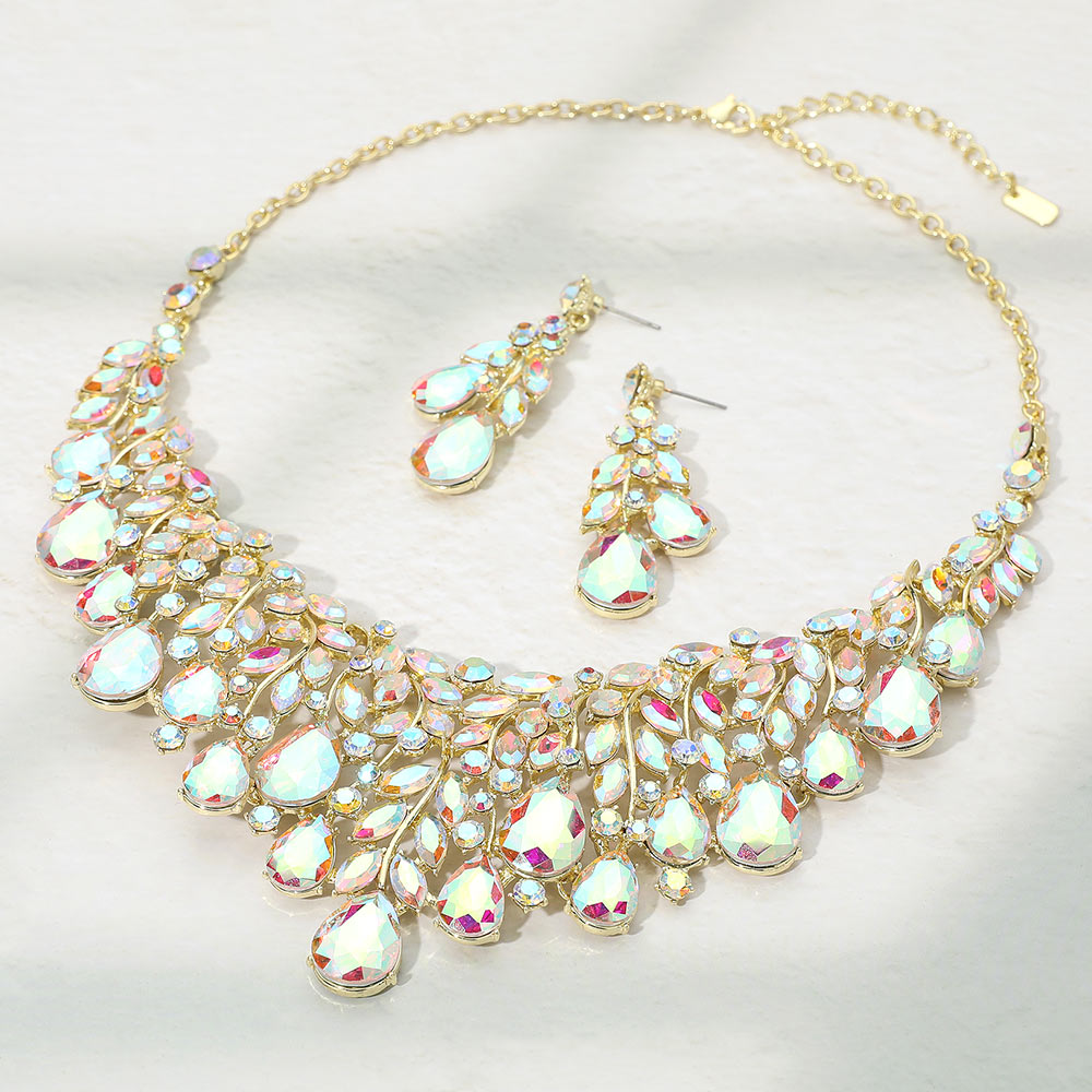 Details • Necklace Size : 18" + 3" L • Decor Size : 2.5" L • Earrings Size : 2" L • Exquisite statement necklace and matching earrings featuring a stunning teardrop gem cluster design. Perfect for formal occasions, weddings, or evening events, this jewelry set adds instant glamour and sophistication to any outfit with its luxurious sparkle and refined detailing.