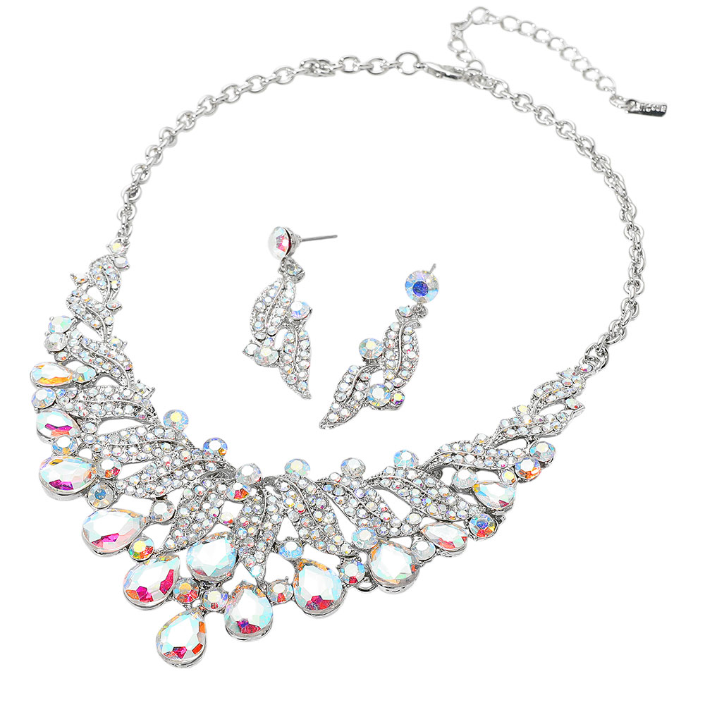 • Luxurious jewelry set featuring an ornate leaf-patterned necklace and matching teardrop earrings. Perfect for evening events, weddings, or special occasions, adding sophistication and glamour. A bold statement piece that enhances any elegant outfit with radiant charm and style.