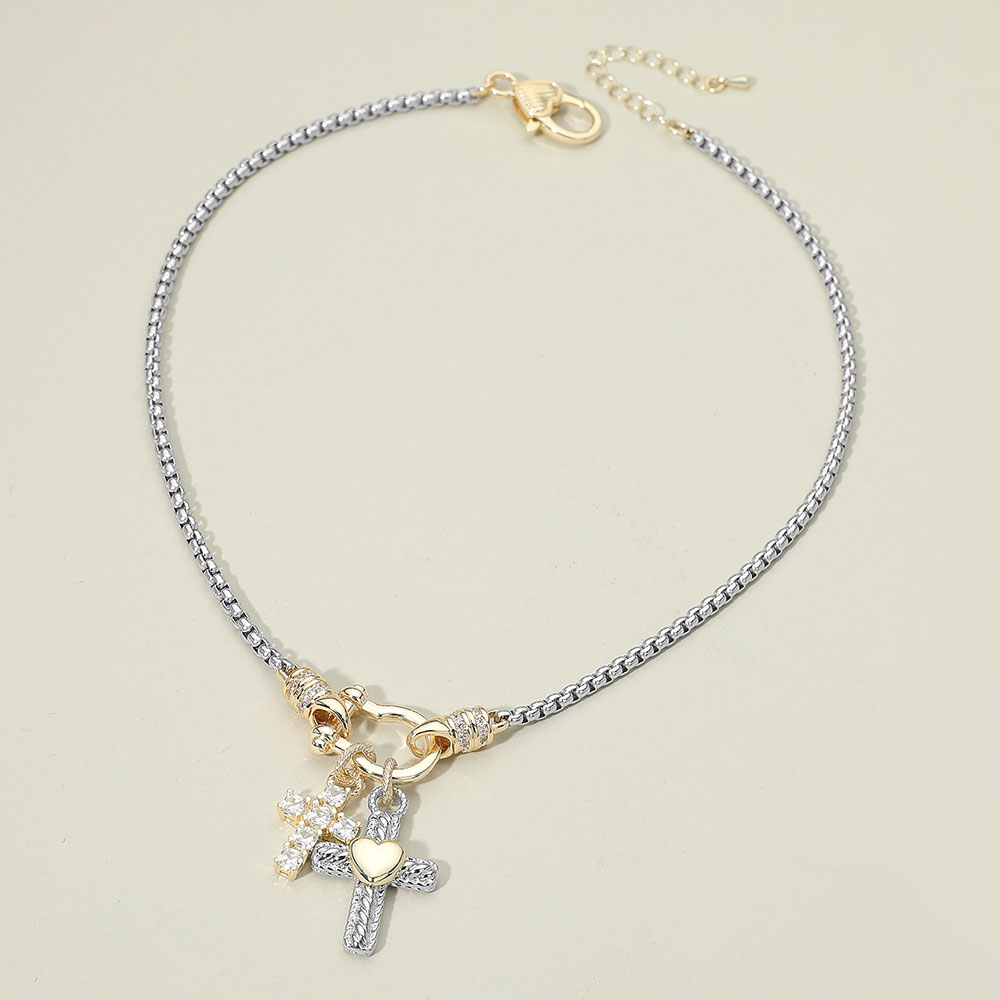 Details • Necklace Size : 18" + 2" L • Pendant Size : 2" L • Elegant chain necklace featuring cross and heart charms accented with sparkling details. Designed with a secure clasp, this meaningful accessory blends faith and style, making it a versatile addition to any jewelry collection. • CZ Cubic Zirconia • Gold Dipped