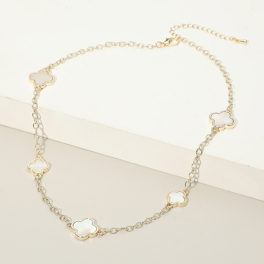 Details • Necklace Size : 16.5" + 2" L • Decor Size : 0.6" L • Elevate your style with this chic quatrefoil station necklace, crafted with a sleek silhouette and timeless charm. Its delicate linked design offers a refined accent for both casual and elegant looks, making it an effortless piece to layer or wear alone for everyday sophistication. • Gold Dipped