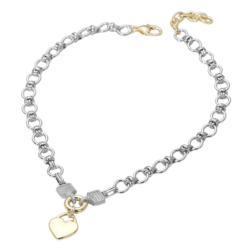 Details • Necklace Size : 18" + 2" L • Decor Size : 1.4" L • Modern two-tone necklace featuring a polished heart pendant suspended from a bold link chain. Designed with mixed finishes for a stylish contrast, this versatile piece is perfect for layering or wearing solo as a standout accessory. • CZ Cubic Zirconia • Gold Dipped