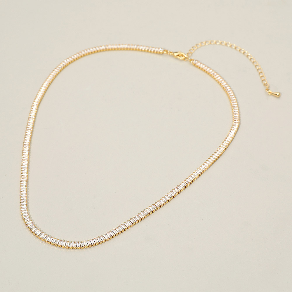 • Sophisticated tennis necklace featuring sleek baguette-cut crystals for a refined, modern shine. Perfect for formal events or elevating everyday looks, offering timeless beauty and elegance. A luxurious jewelry piece that adds radiant sparkle and style to any outfit effortlessly.