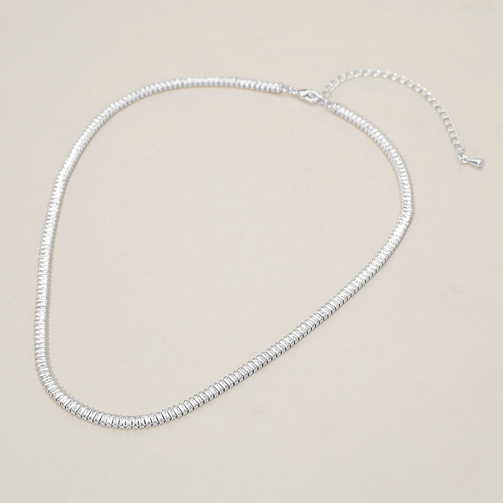 • Sophisticated tennis necklace featuring sleek baguette-cut crystals for a refined, modern shine. Perfect for formal events or elevating everyday looks, offering timeless beauty and elegance. A luxurious jewelry piece that adds radiant sparkle and style to any outfit effortlessly.