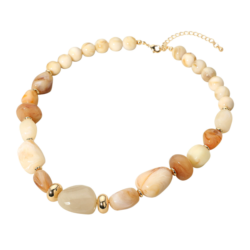 Details • Necklace Size : 18" + 3" L • Decor Size : 0.8" L • Elevate your style with this 18" beaded necklace featuring a mix of smooth round and chunky polished stones. Accented with metallic spacers for added shine, this statement piece blends organic charm with modern elegance, making it perfect for everyday wear or special occasions. • Gold Dipped • Lead and Nickel Compliant • Made In Korea