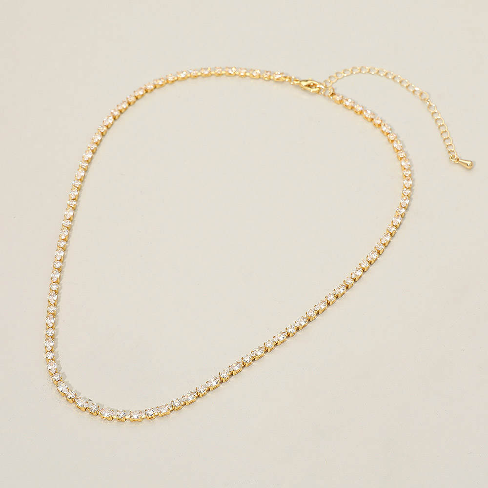 Details • Necklace Size : 16" + 3" L • Decor Size : 0.1" L • Timeless tennis chain necklace featuring perfectly aligned round and marquise crystals that catch the light beautifully. Ideal for adding elegance to casual or formal looks, this piece delivers effortless sophistication. A must-have accessory for refined, minimalist, and modern jewelry collections. • Gold Dipped • Lead and Nickel Compliant