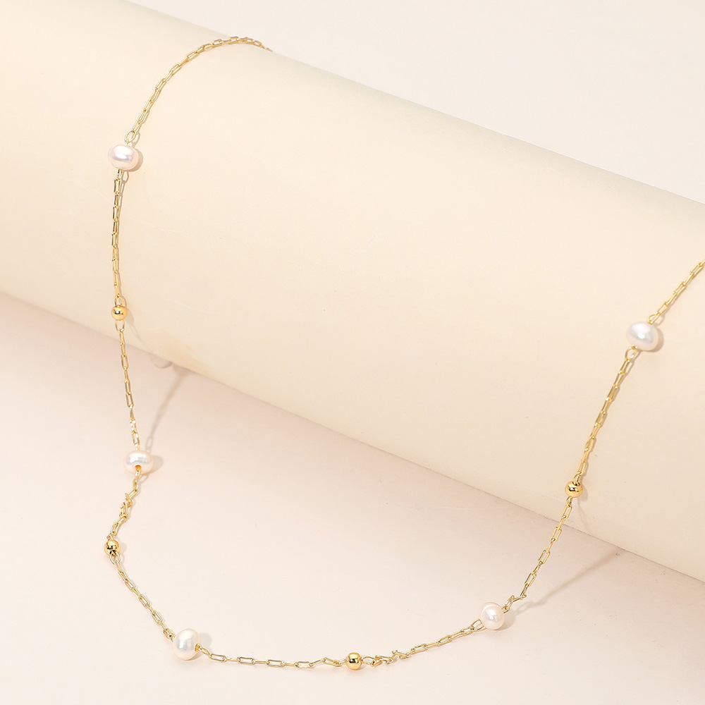 Details • Necklace Size : 16" + 3.5" L • Decor Size : 0.2" L • Elegant minimalist necklace featuring a fine chain adorned with small freshwater pearl and subtle accents for a refined look. Perfect for layering or wearing solo, adding understated sophistication to any outfit. A timeless accessory that complements both casual and formal styles beautifully. • Gold Dipped • Lead and Nickel Compliant