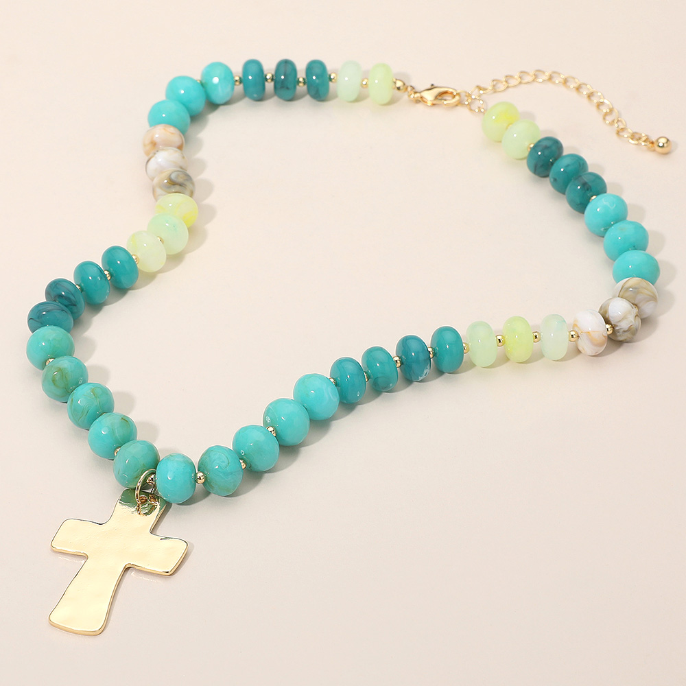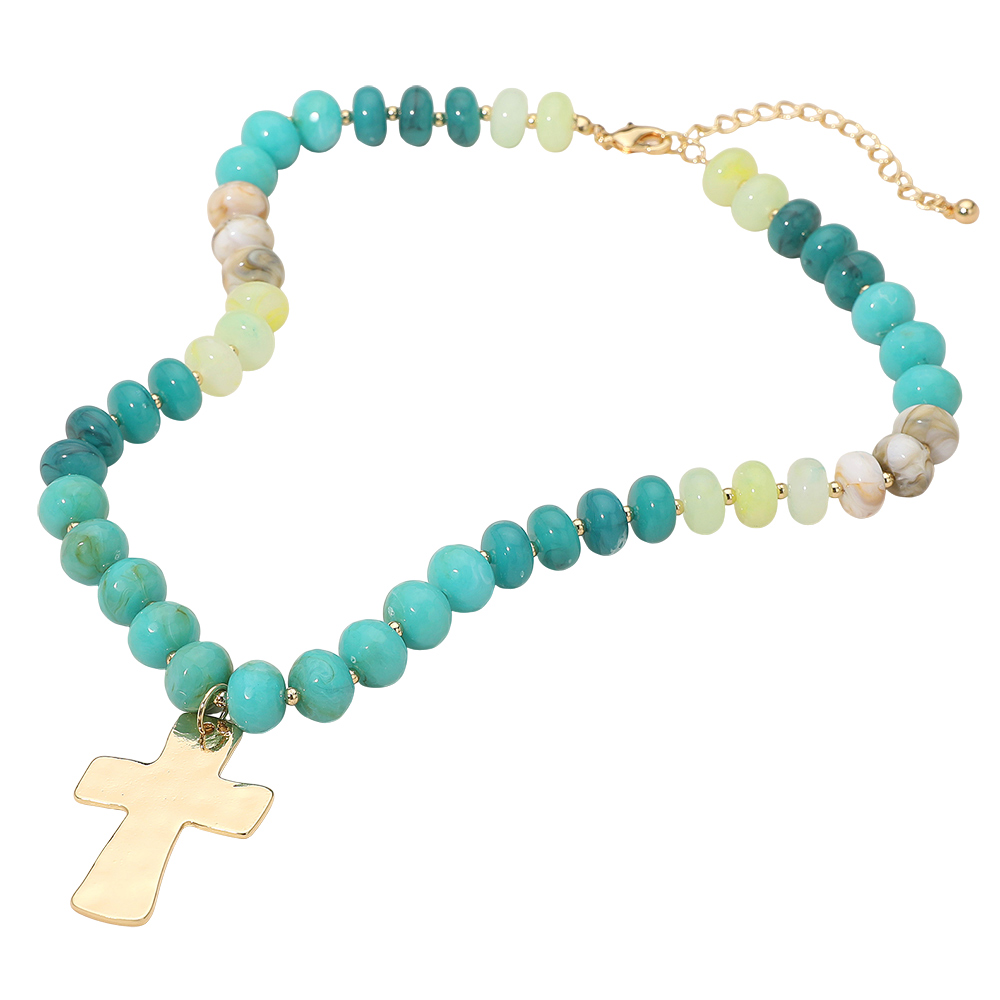 18K Gold Dipped Hammered Cross Plate Pendant Chunky Resin Disc Beaded Necklace