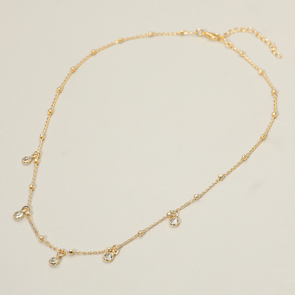 Details • Necklace Size : 16" + 2" L • Decor Size : 0.3" L • Elegant beaded chain necklace adorned with small round crystals that dangle gracefully along the neckline. Each charm catches the light for a subtle sparkle, creating a refined, feminine accessory perfect for layering or adding shimmer to any outfit. • Gold Filled • Lead and Nickel Compliant • Made In Brazil
