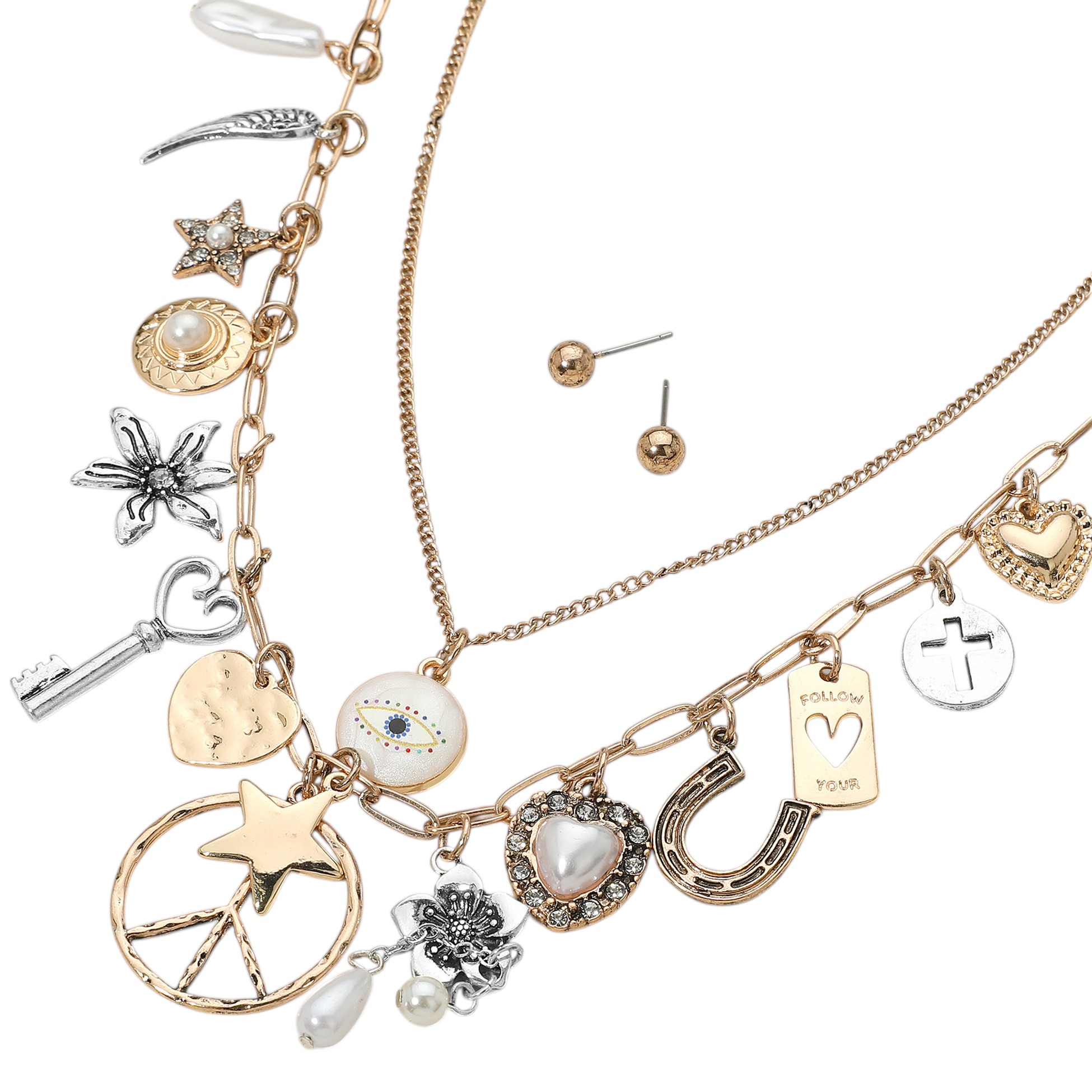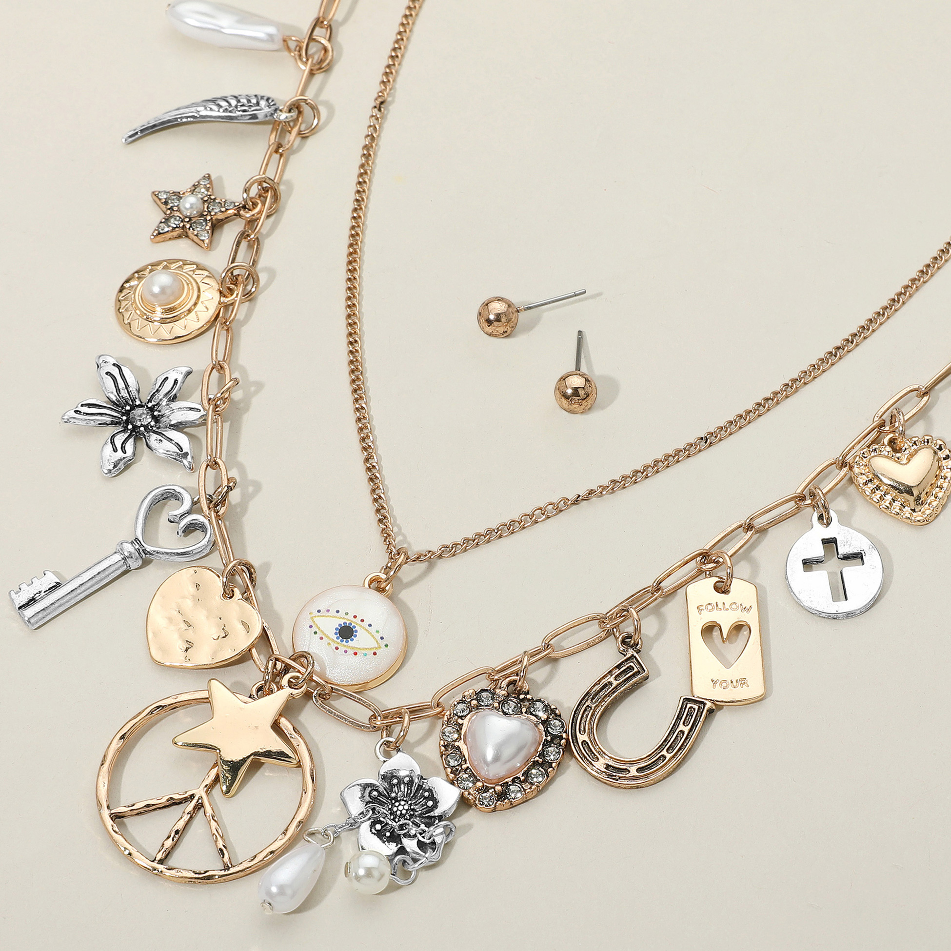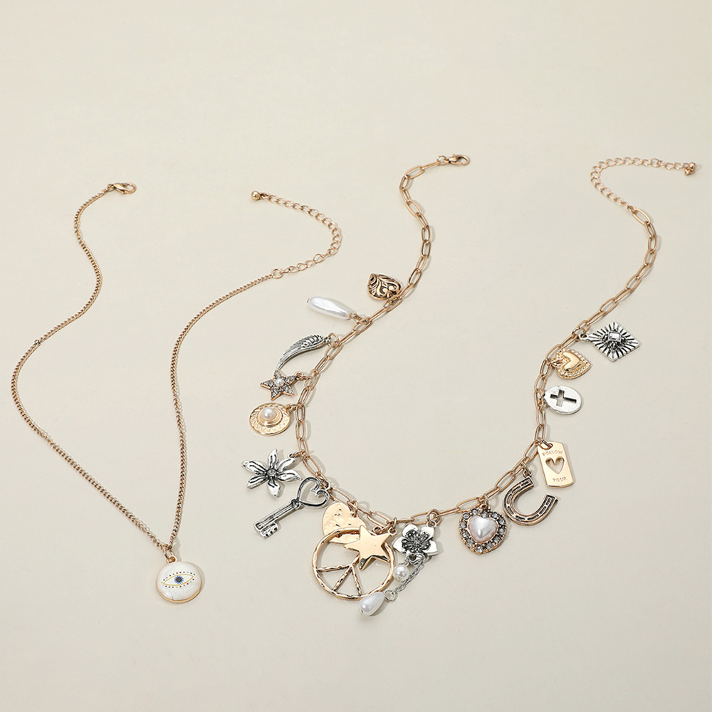 2PCS - Evil Eye Stone Paved Mother of Pearl Disc Pendant Boho Peach Pearl Star Heart Key Charm Station Paperclip Chain Necklaces