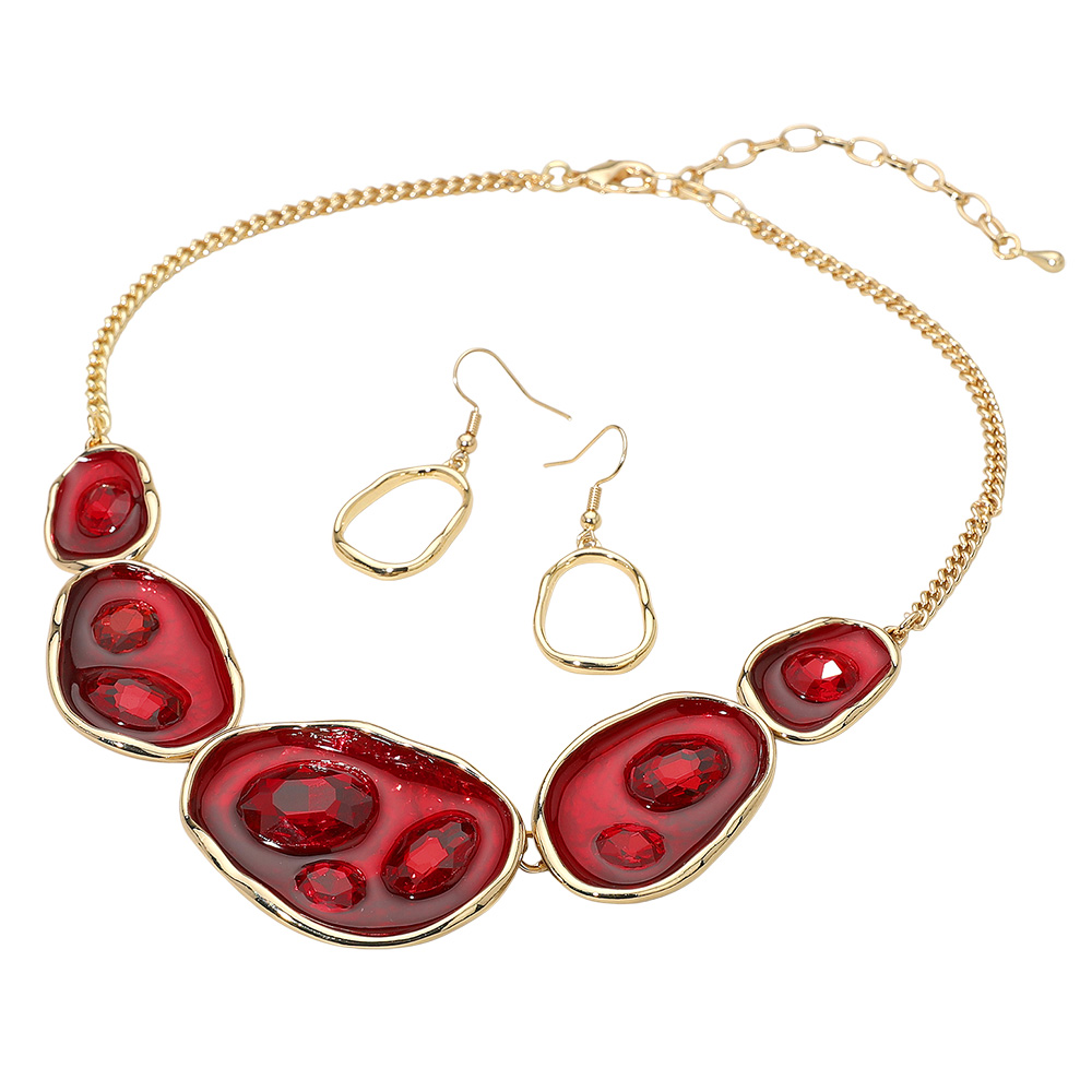 Details • Necklace Size : 16" + 3.25" L • Decor Size : 1.3" L • Earrings Size : 1.6" L • Contemporary jewelry set featuring a bold necklace and matching earrings with artistic gem accents framed in fluid shapes. Perfect for parties, formal events, or chic everyday wear. A statement-making accessory that combines modern style with elegant sophistication. • Lead and Nickel Compliant