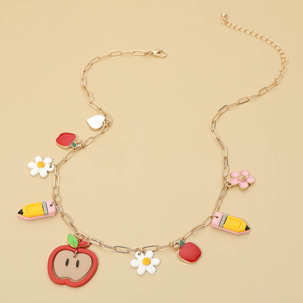 Details • Necklace Size : 16.25" + 3.25" L • Decor Size : 1.5" L • This playful charm accent necklace features a mix of whimsical motifs suspended along a delicate chain, creating a fun and expressive statement piece. Ideal for casual outfits, themed collections, and gift displays, it adds personality and movement while remaining lightweight and easy to layer for everyday or seasonal styling. • Lead and Nickel Compliant