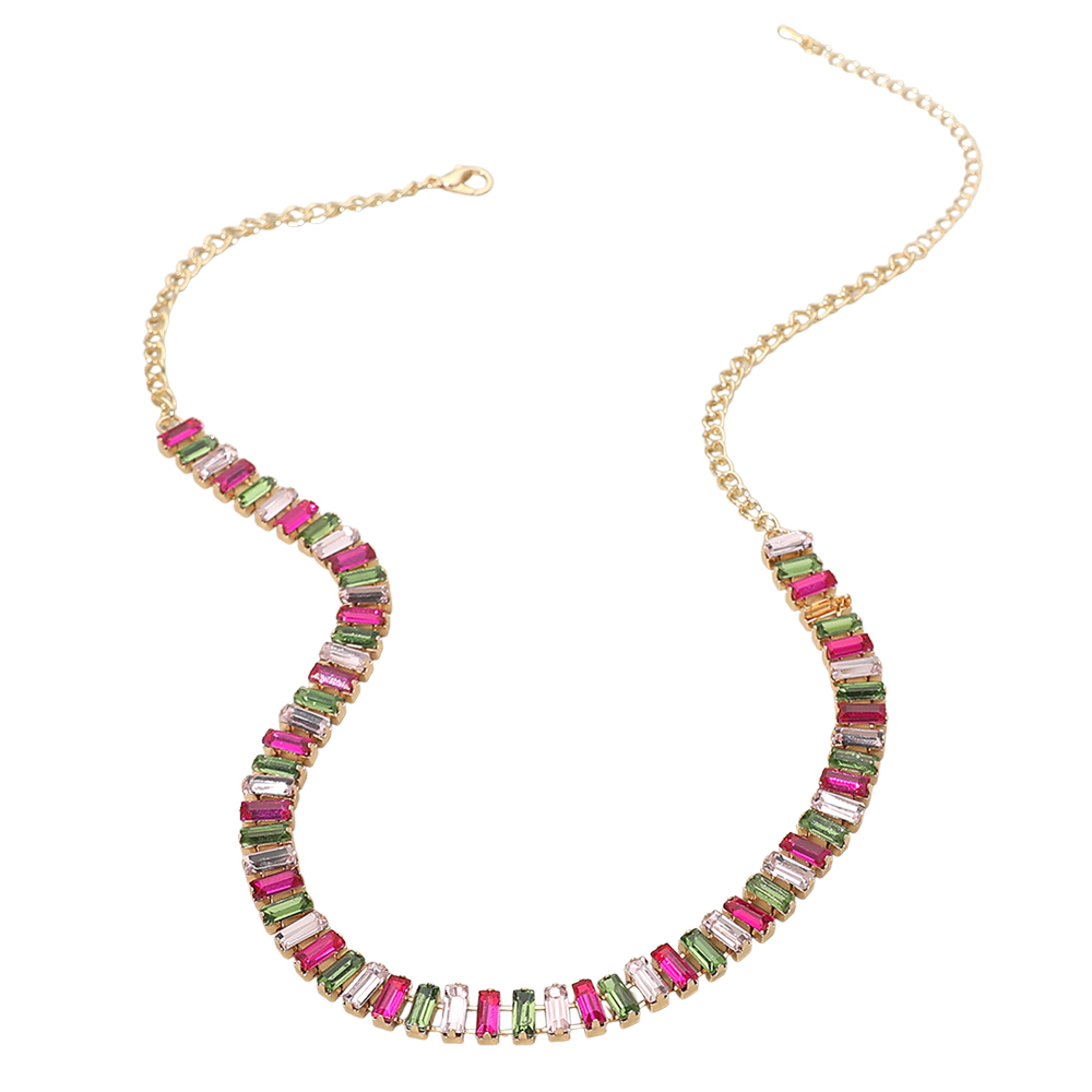 Details • Necklace Size : 18.25" + 3" L • Decor Size : 0.3" L • This statement necklace features a sleek row of baguette style accents arranged along a classic chain for a refined yet eye catching look. Designed to elevate everyday outfits or complete evening styling, it offers a balanced blend of structure and shine. Ideal for layered looks, gift selections, and curated accessory assortments. • Lead and Nickel Compliant