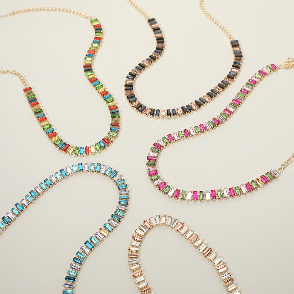 Details • Necklace Size : 18.25" + 3" L • Decor Size : 0.3" L • This statement necklace features a sleek row of baguette style accents arranged along a classic chain for a refined yet eye catching look. Designed to elevate everyday outfits or complete evening styling, it offers a balanced blend of structure and shine. Ideal for layered looks, gift selections, and curated accessory assortments. • Lead and Nickel Compliant