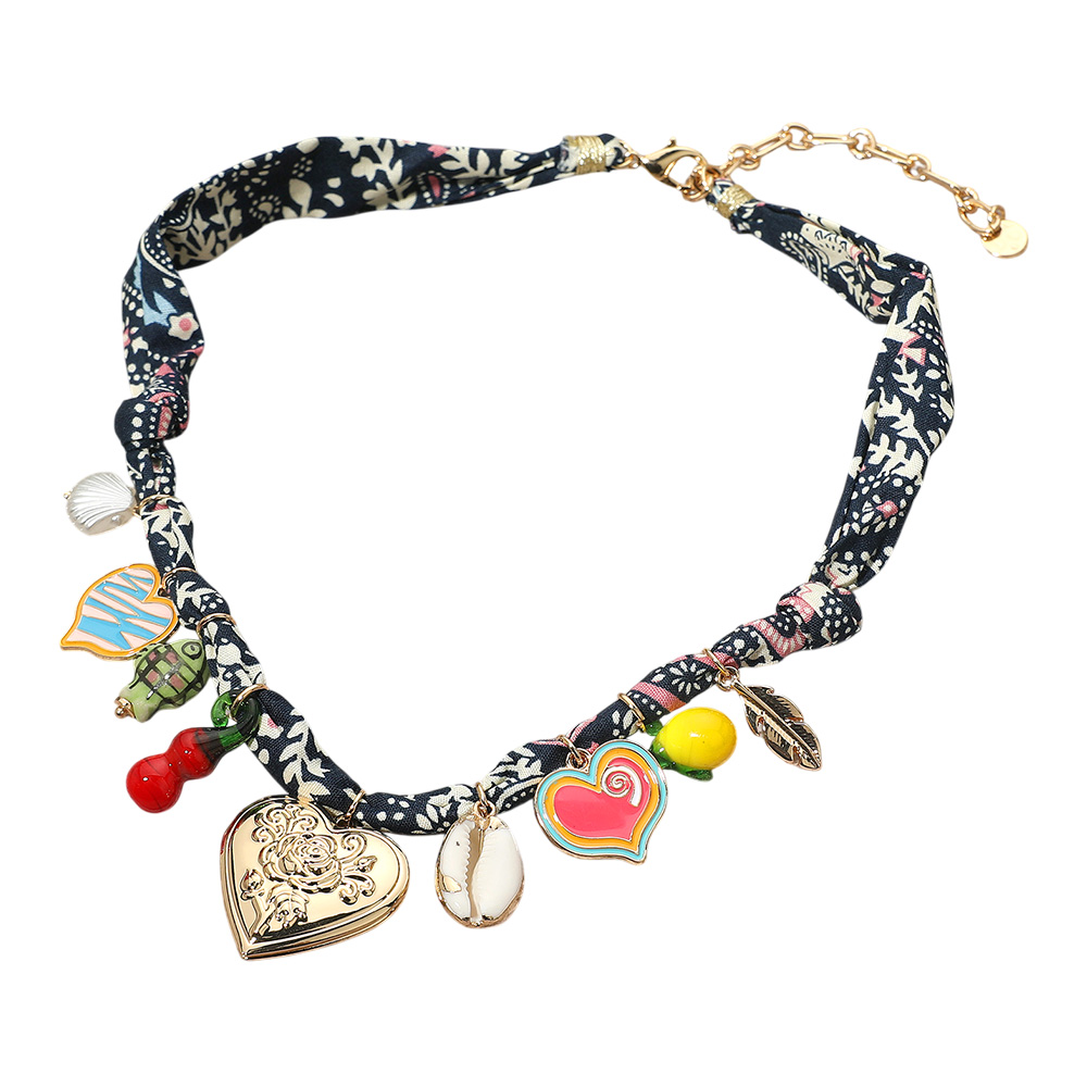 Details • Necklace Size : 17.5" + 3.75" L • Decor Size : 1.4" L • Make a statement with this boho-chic fabric necklace featuring playful charms, including a locket heart, seashell, lemon, cherries, and colorful enamel accents. A vibrant mix of whimsical and coastal elements, perfect for adding personality to everyday and vacation outfits. • Lead and Nickel Compliant
