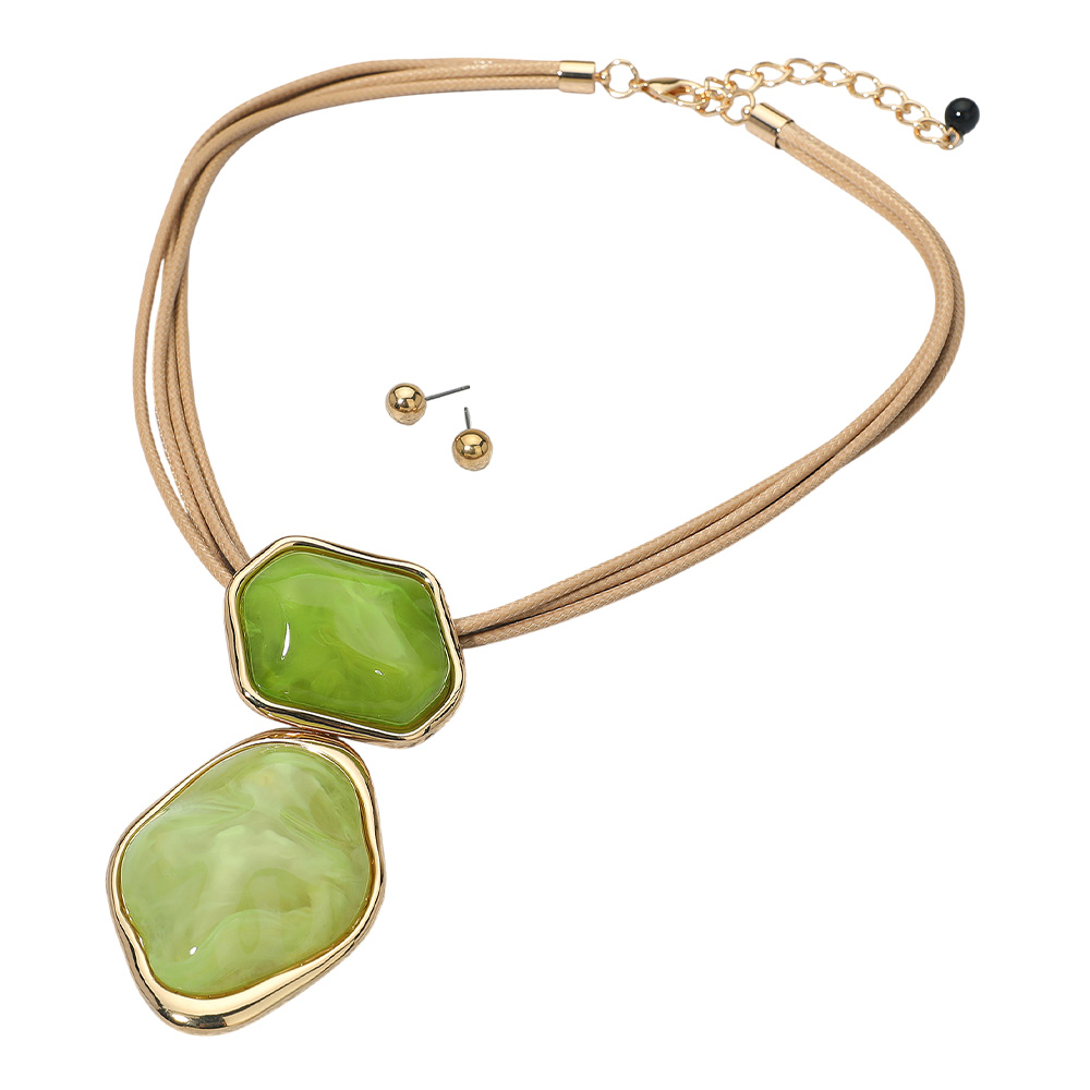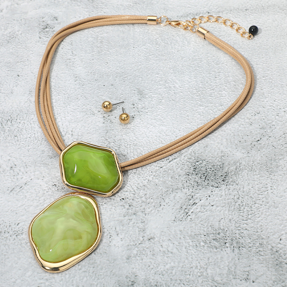 • Bold pendant necklace paired with coordinating stud earrings for a complete look. The unique layered design adds eye-catching detail, making this set perfect for elevating casual outfits or complementing evening attire with effortless elegance.