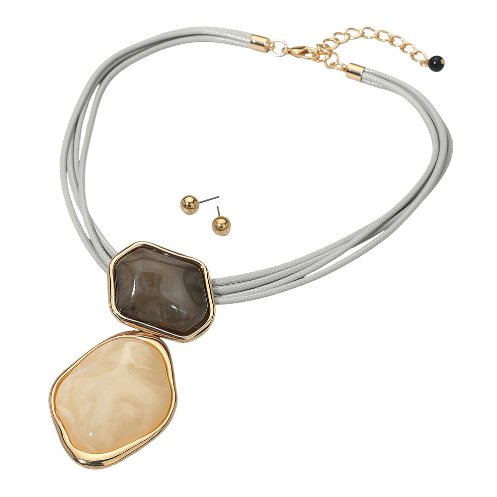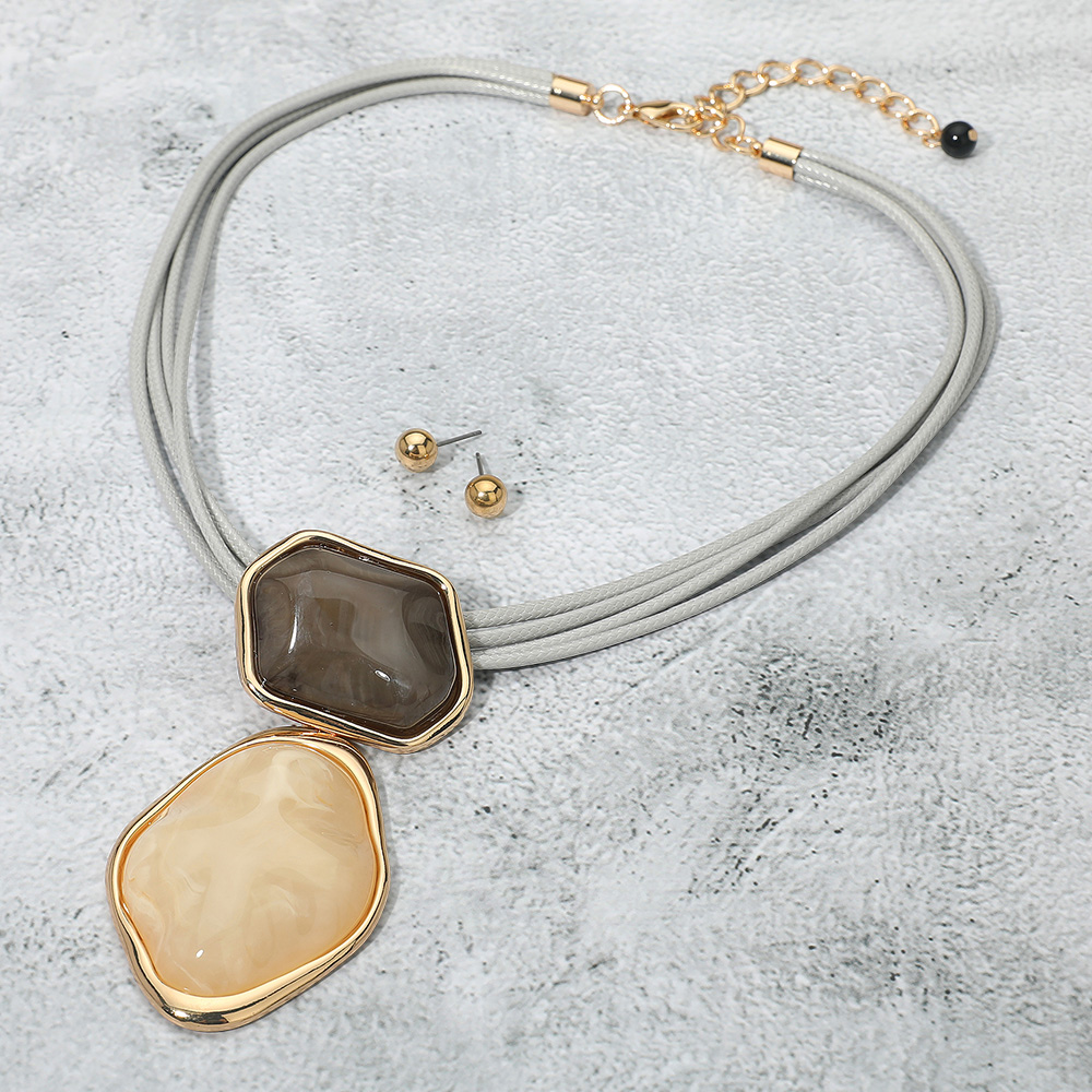 • Bold pendant necklace paired with coordinating stud earrings for a complete look. The unique layered design adds eye-catching detail, making this set perfect for elevating casual outfits or complementing evening attire with effortless elegance.
