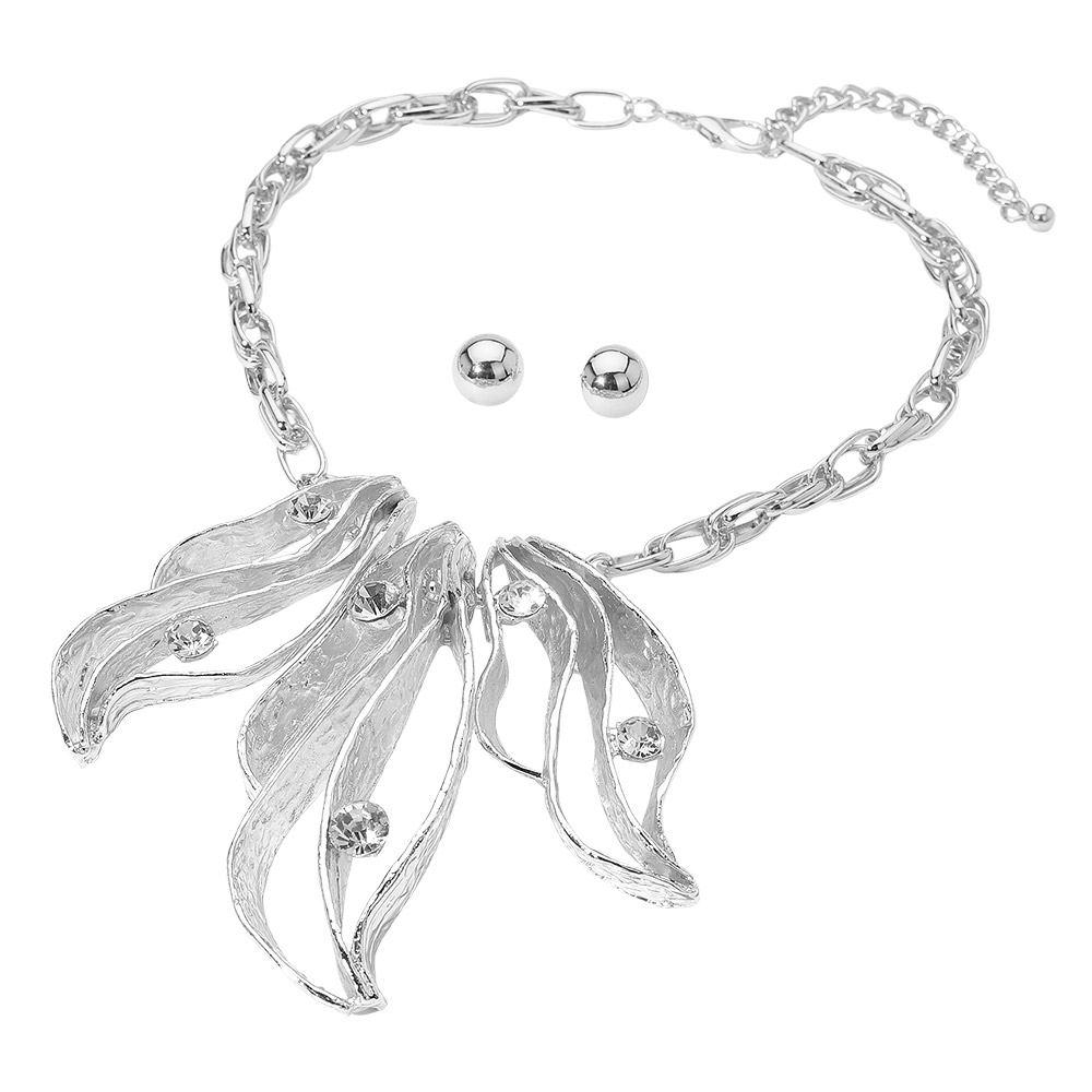 Details • Necklace Size : 18" + 3" L • Decor Size : 4" L • Earrings Size : 0.5" L • This abstract leaf statement necklace set captures artistic sophistication with its sculpted openwork design and sparkling crystal accents. Paired with simple stud earrings, it creates a balanced, elegant look perfect for formal occasions or adding a refined touch to everyday style. • Lead and Nickel Compliant