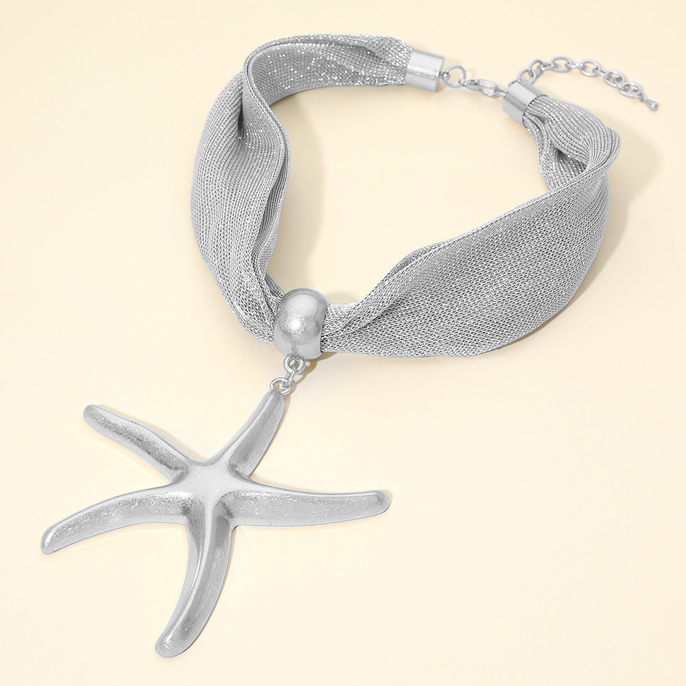 Bold Brushed Metal Starfish Pendant Mesh Statement Necklace