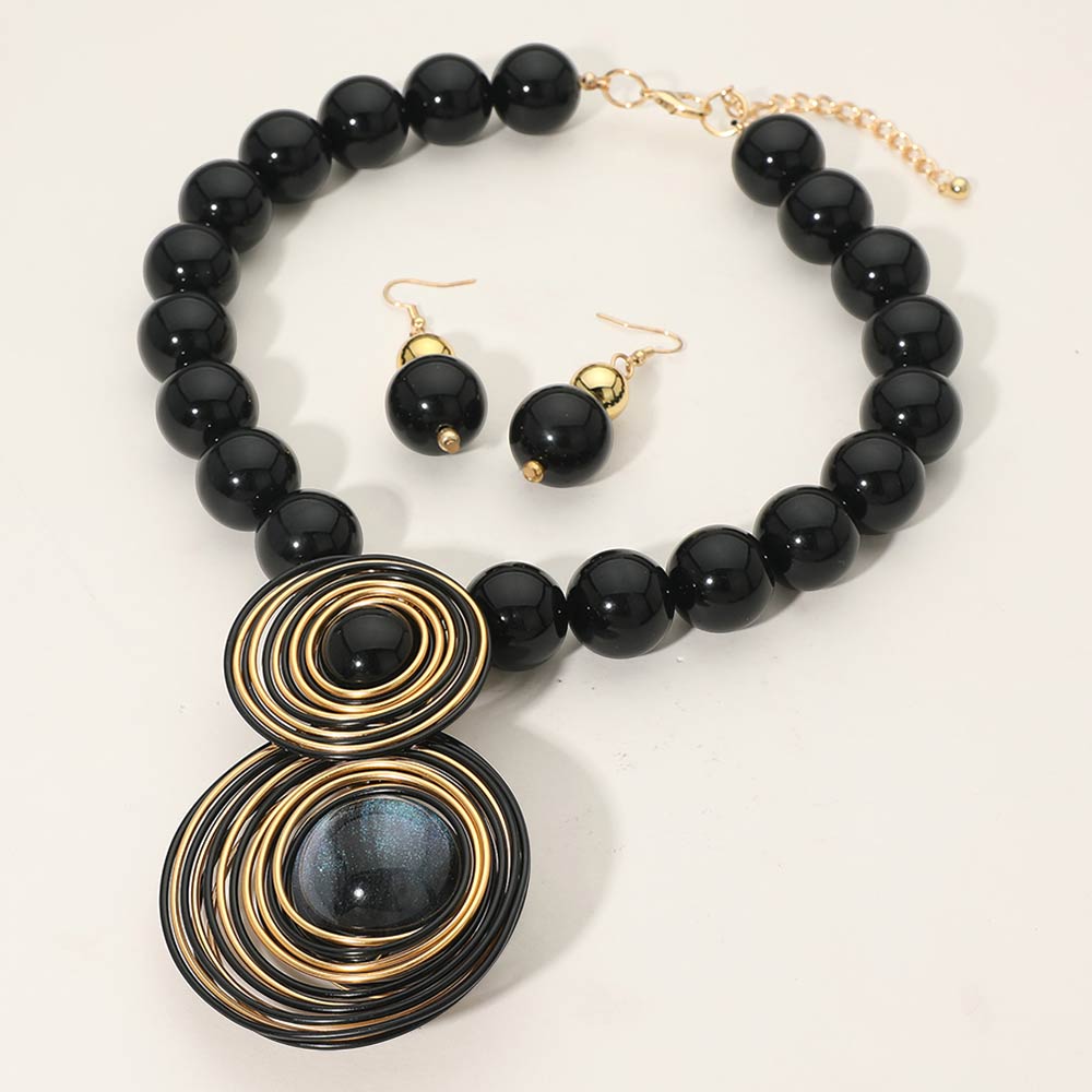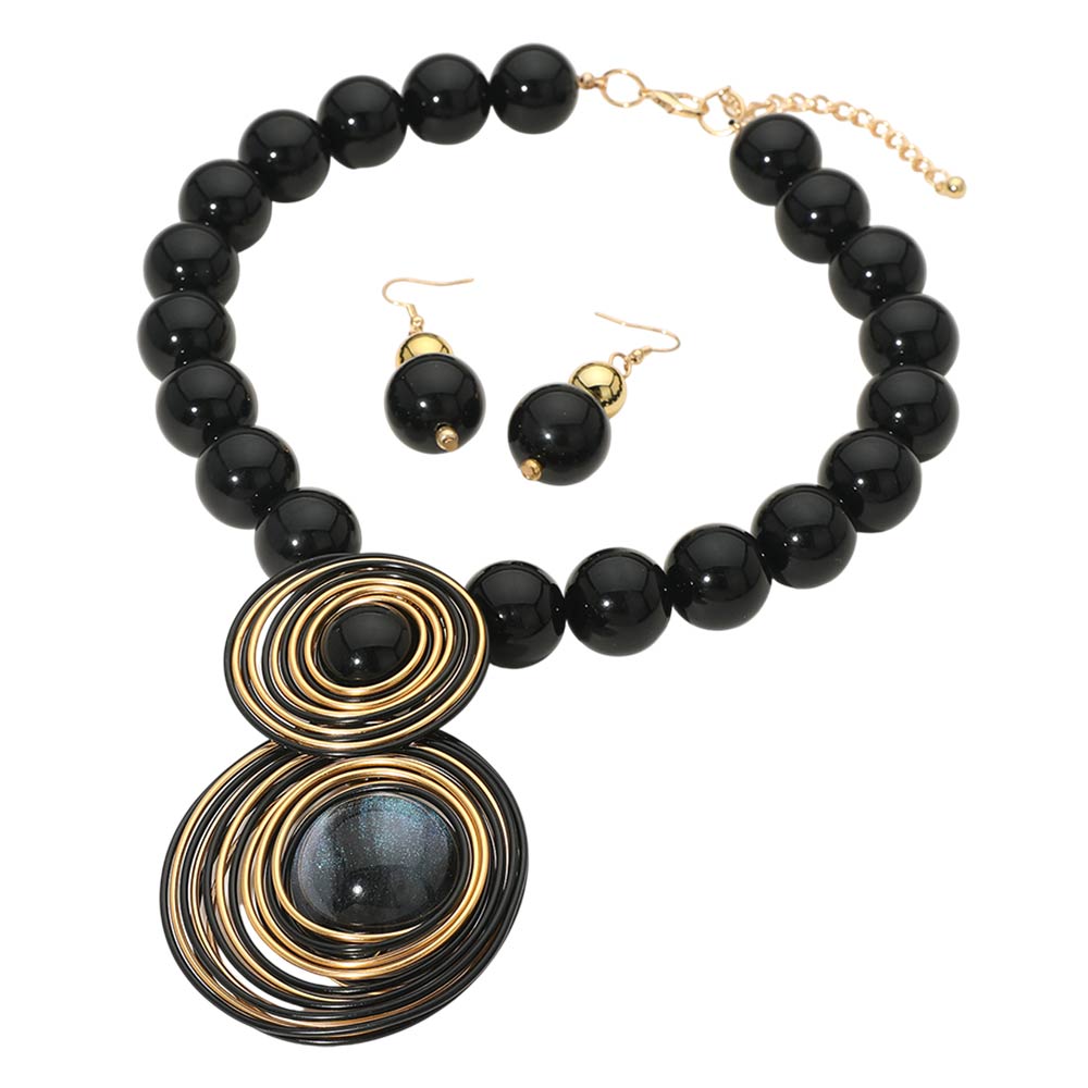 Details • Necklace Size : 17.5" + 3" L • Decor Size : 3.75" L • Earrings Size : 2.25" L • This statement beaded necklace and earring set delivers bold, coordinated style with a striking pendant design and matching drop earrings. Created to elevate everyday outfits or complete dressy looks, this set is ideal for gifting, boutique collections, and trend-driven displays. A versatile accessory that adds polished impact to any jewelry assortment. • Lead and Nickel Compliant