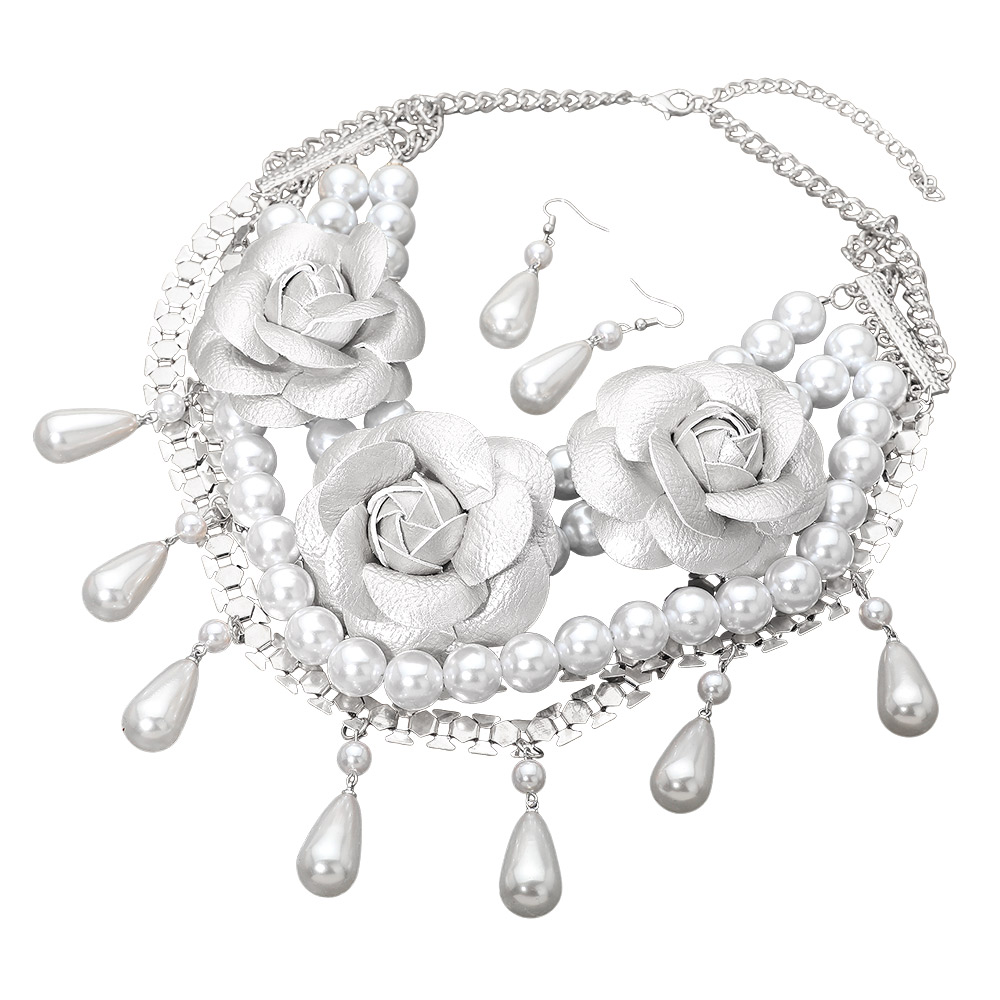 Details • Necklace Size : 20.5" + 4" L • Decor Size : 5.5" L • Earrings Size : 2.3" L • A striking statement set featuring layered beads, sculpted floral accents, and elegant drop details. Its dramatic silhouette enhances any special-occasion look, offering a refined and artistic accessory with timeless appeal. • Lead and Nickel Compliant