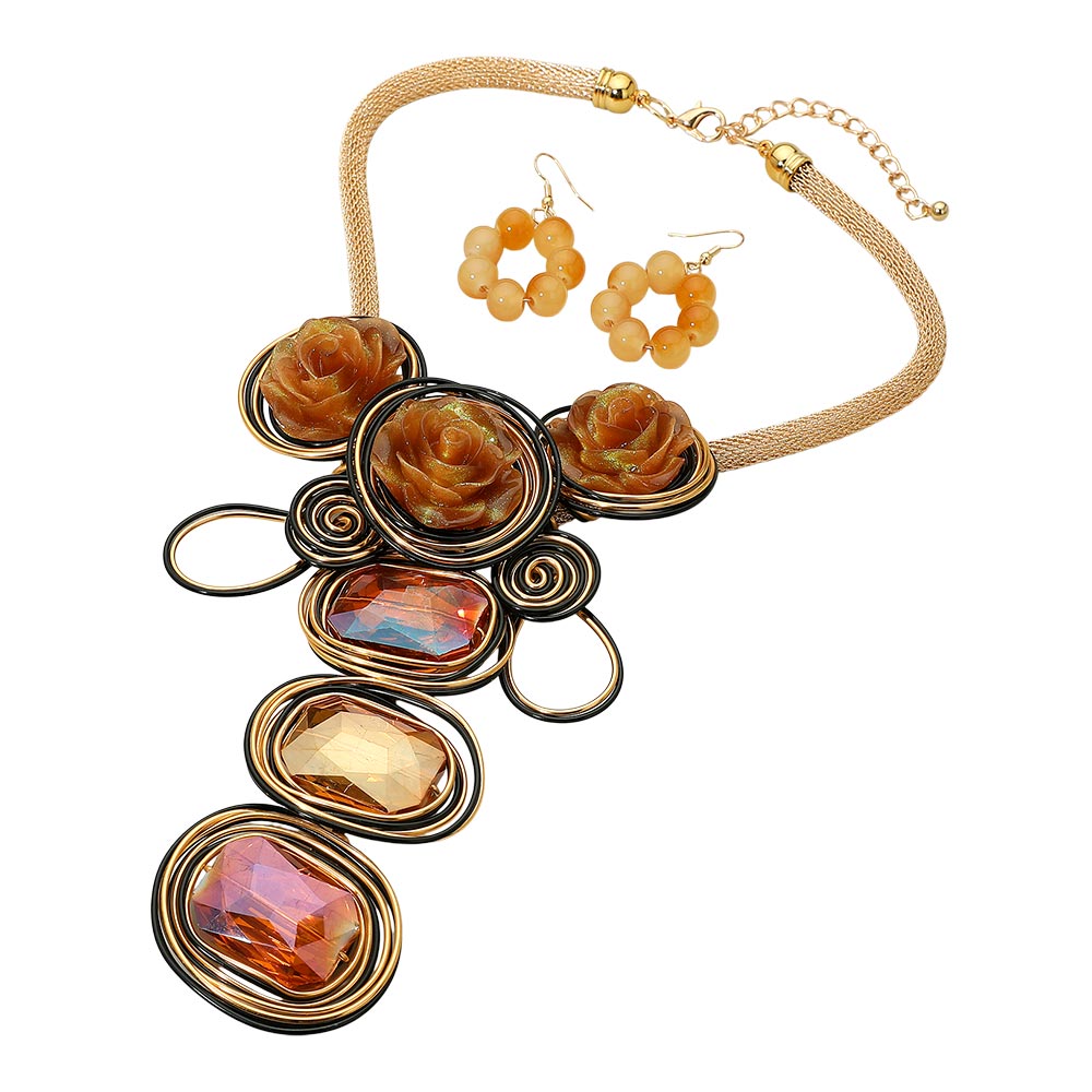 • This bold statement necklace and earring set showcases an artistic blend of floral motifs and faceted gem accents. Designed to stand out, it adds dramatic elegance and creative flair to any outfit, making it the perfect accessory for special events or evening glamour.