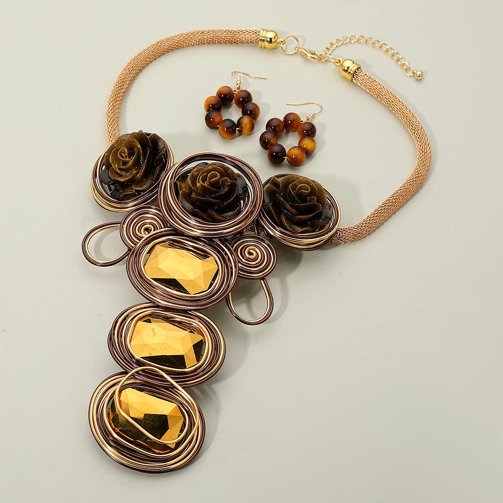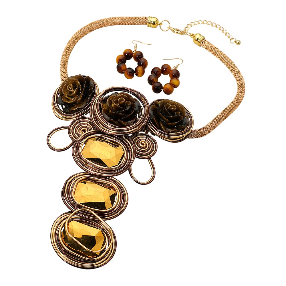 Details • Necklace Size : 19" + 3" L • Decor Size : 7" L • Earrings Size : 2" L • This bold statement necklace and earring set showcases an artistic blend of floral motifs and faceted gem accents. Designed to stand out, it adds dramatic elegance and creative flair to any outfit, making it the perfect accessory for special events or evening glamour. • Lead and Nickel Compliant