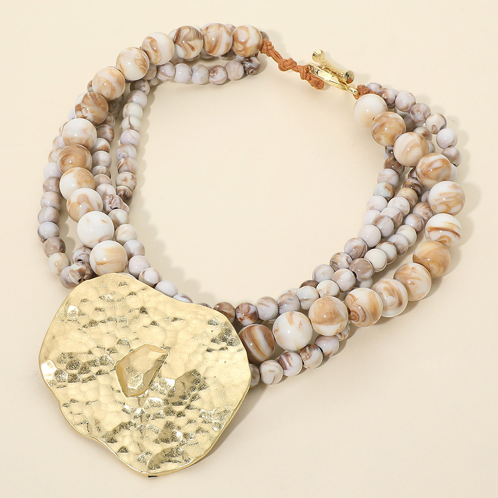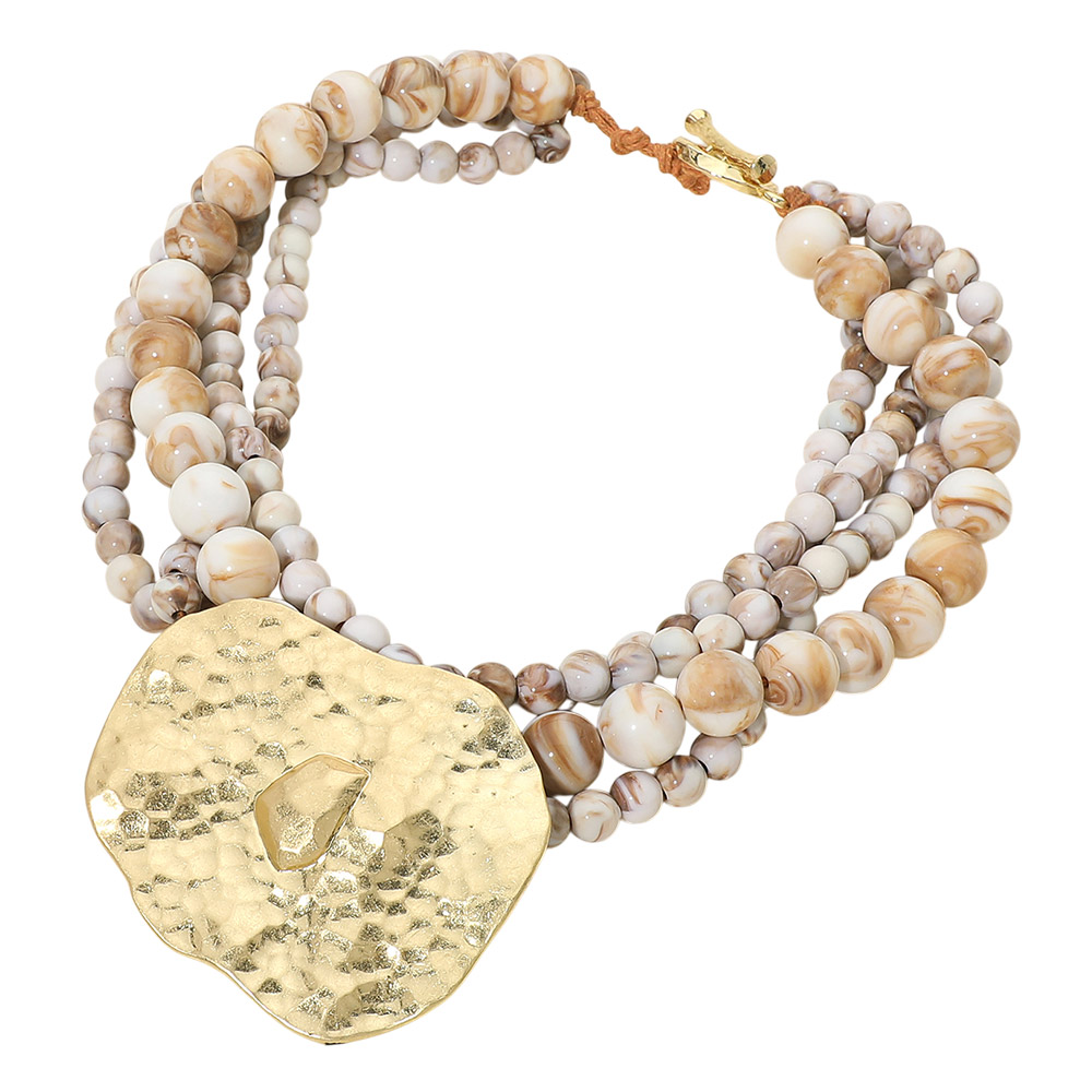 • Eye-catching statement necklace designed with layered beaded strands and a bold textured pendant that creates depth and movement. This standout design offers a sculptural, fashion-forward look ideal for boutiques seeking unique statement jewelry that elevates everyday outfits, resort wear, and modern accessory collections.
