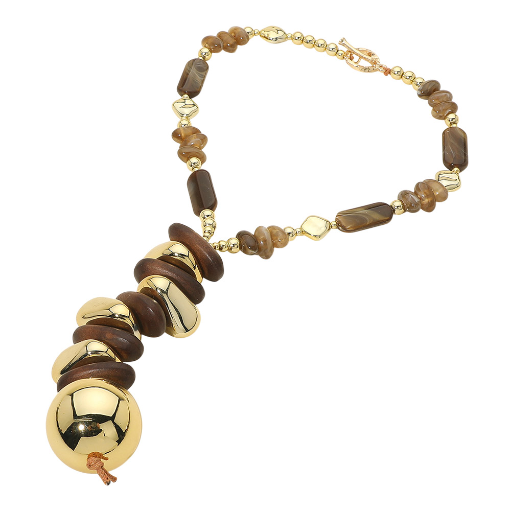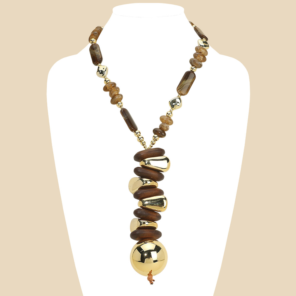 Details • Necklace Size : 20" + 1" L • Decor Size : 5.75" L • Bold vertical drop necklace featuring mixed bead shapes arranged in a cascading silhouette with a smooth statement focal accent. Designed to add length and visual impact, this necklace is ideal for boutiques seeking eye-catching accessories with modern statement appeal and versatile styling potential. • Lead and Nickel Compliant