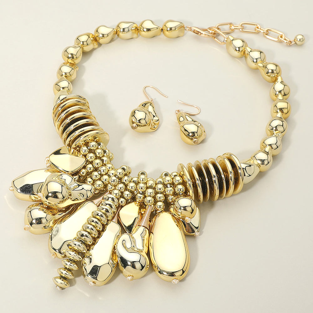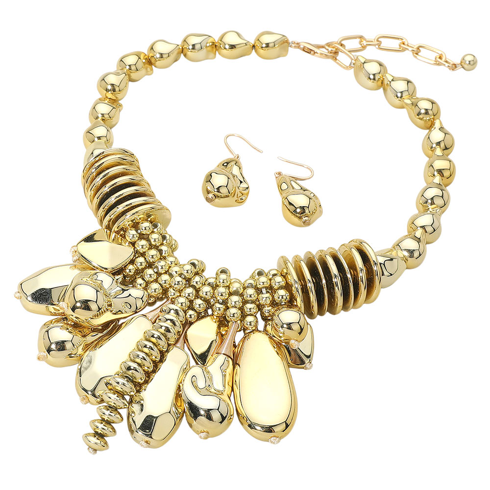 • This statement charm necklace and matching earring set features layered beads and sculptural accents for a bold, fashion-forward look. Designed to elevate boutique collections, it offers strong visual impact, versatile styling options, and standout appeal for trend-driven outfits and modern statement jewelry displays.