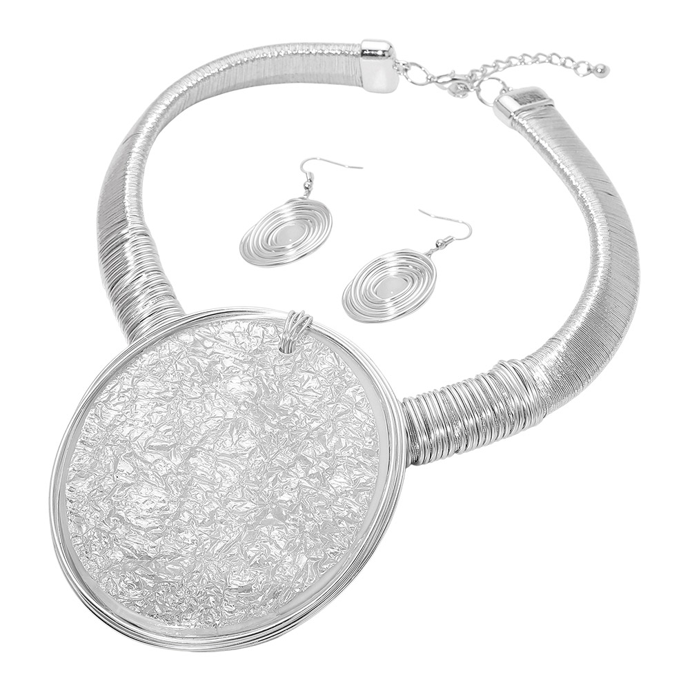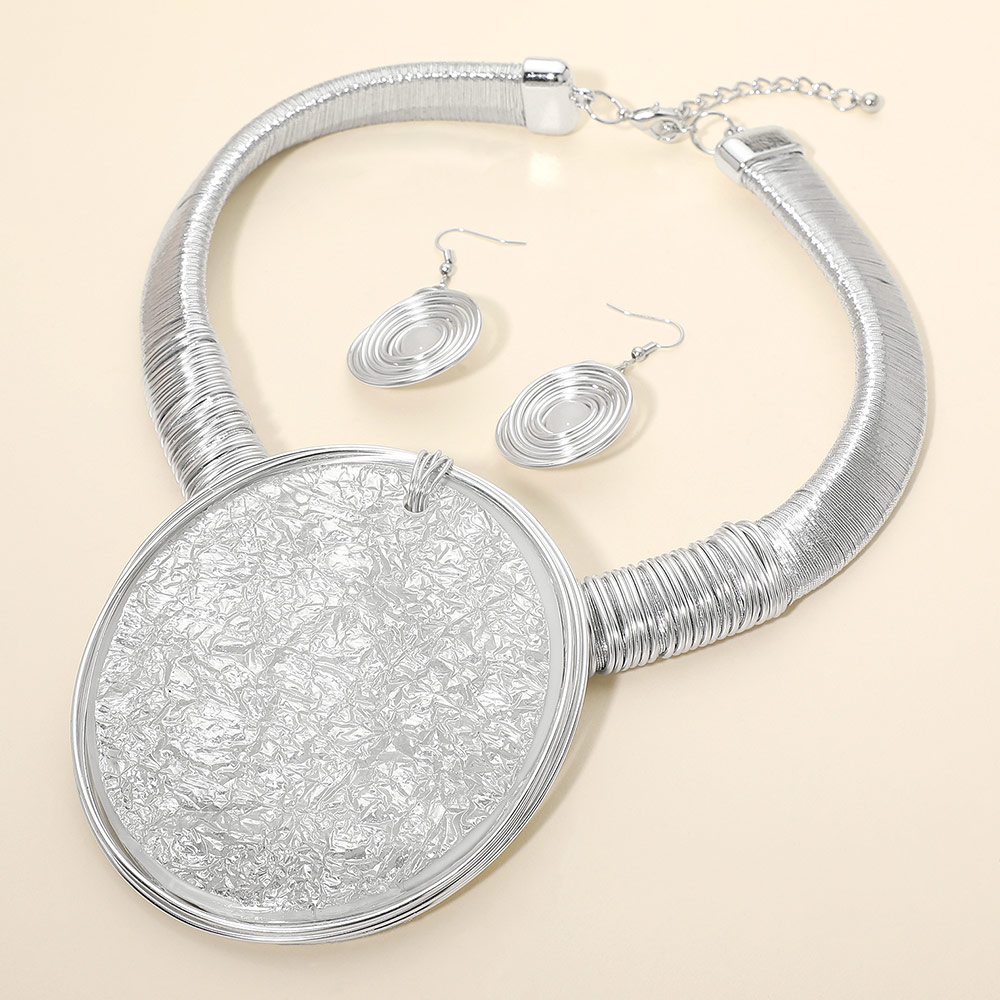 • This bold jewelry set features an oversized textured pendant paired with matching spiral earrings for a coordinated, artful look. Designed to stand out, it adds expressive style and sculptural detail to any outfit, making it ideal for special occasions or dramatic everyday wear.