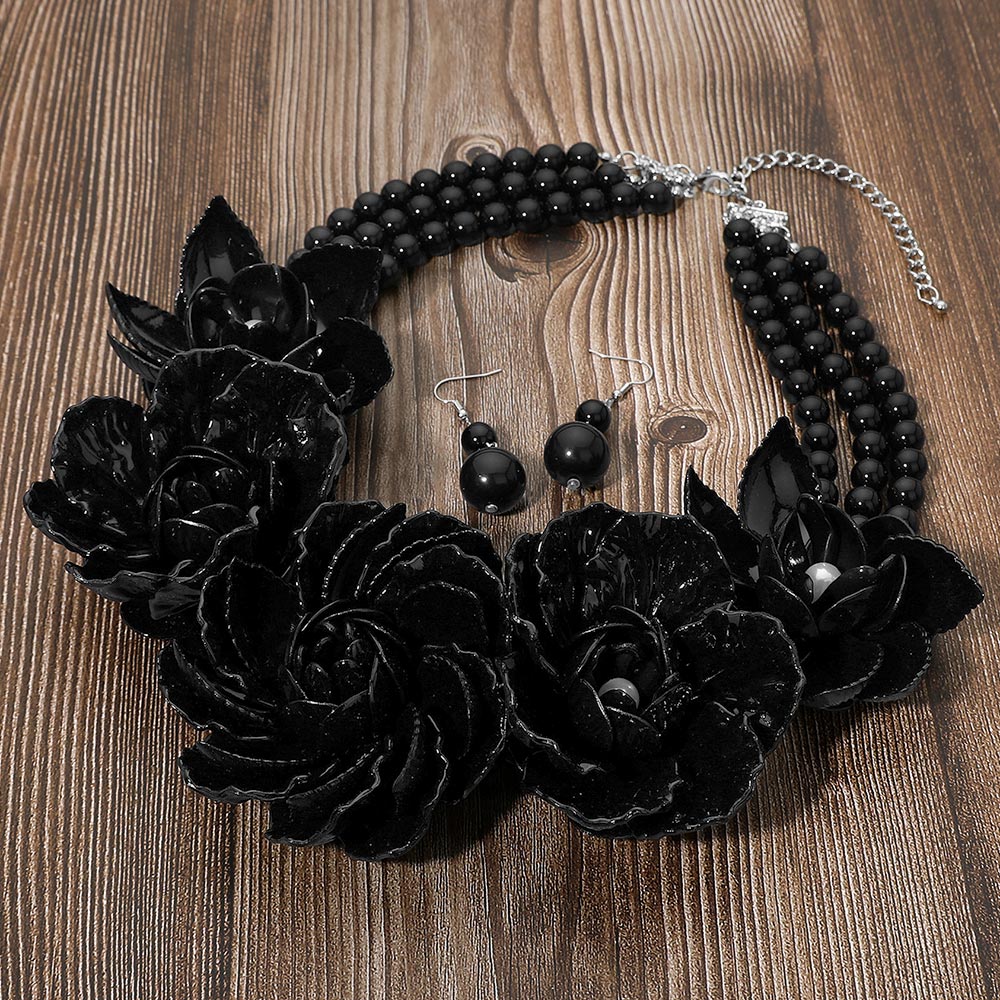Details • Necklace Size : 21" + 4" L • Decor Size : 3.5" L • Earrings Size : 2" L • An elegant statement necklace set featuring layered floral accents and coordinating earrings with an adjustable fit. Designed to elevate formal looks, weddings, parties, and special occasions, offering graceful style and standout detail for memorable outfits. • Lead and Nickel Compliant