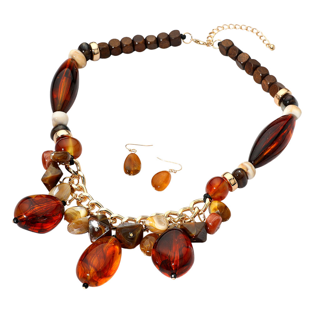 Details • Necklace Size : 22" + 3" L • Decor Size : 2.75" L • Earrings Size : 1.25" L • Bold chunky beaded necklace with dangle accents paired with matching earrings for a stylish coordinated look. Designed to add flair and personality to any outfit, this statement set is perfect for special occasions or enhancing everyday fashion with artistic charm. • Lead and Nickel Compliant