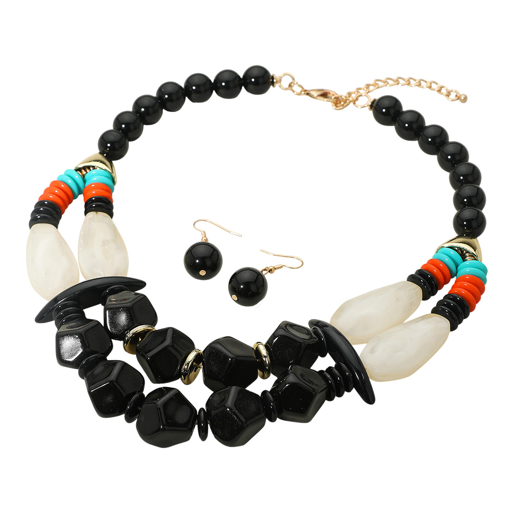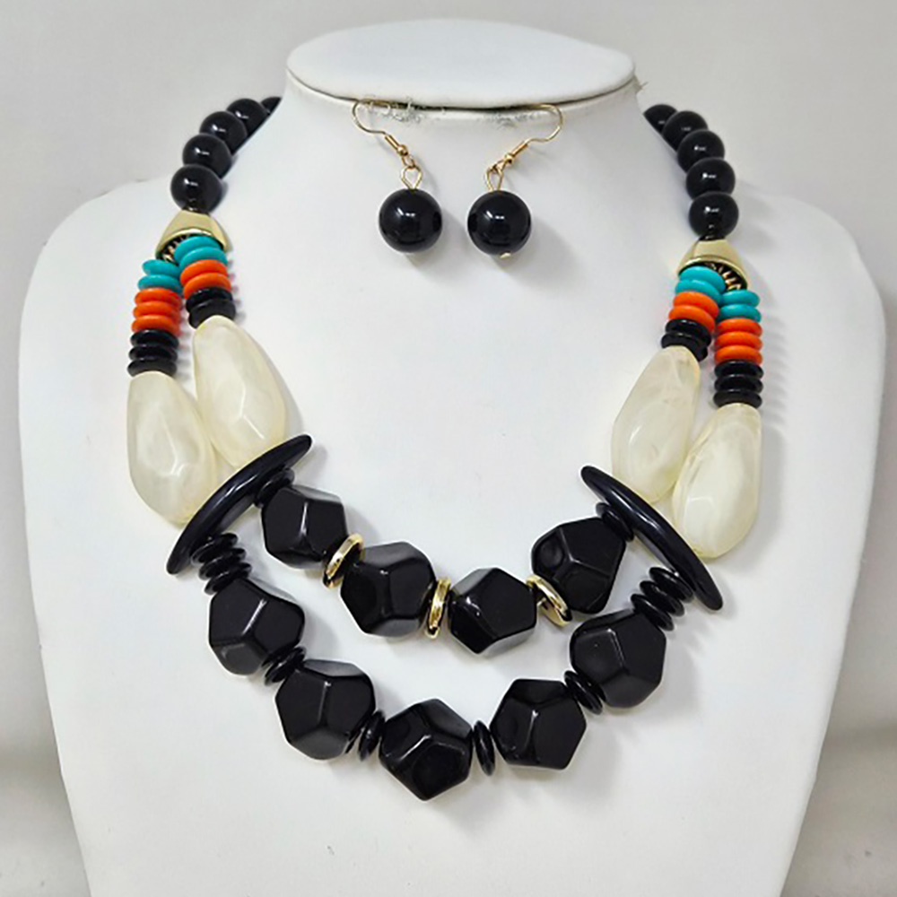• Stand out with this bold beaded statement necklace showcasing chunky black beads, ivory-inspired accents, and colorful disc details. Paired with matching drop earrings, this vibrant jewelry set adds artistic flair and modern edge, perfect for elevating both casual looks and evening outfits.