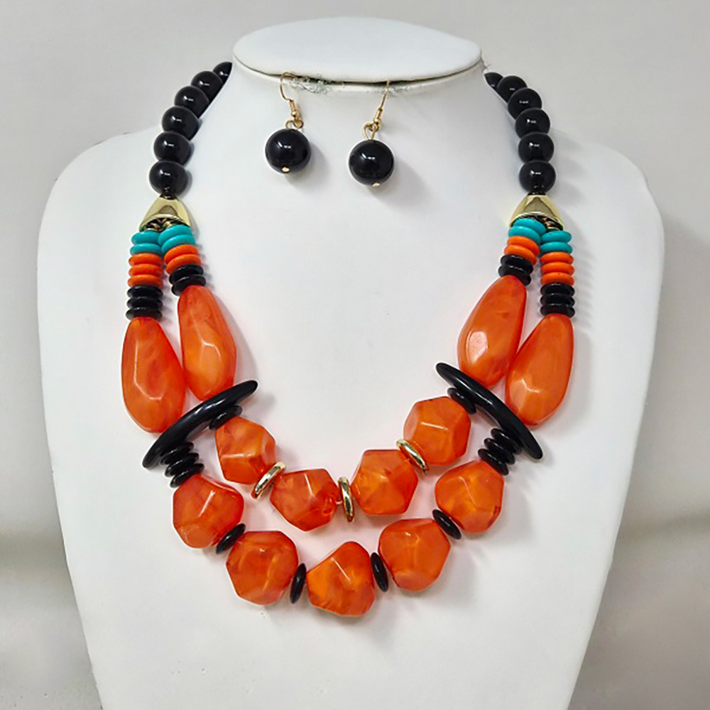 • Stand out with this bold beaded statement necklace showcasing chunky black beads, ivory-inspired accents, and colorful disc details. Paired with matching drop earrings, this vibrant jewelry set adds artistic flair and modern edge, perfect for elevating both casual looks and evening outfits.
