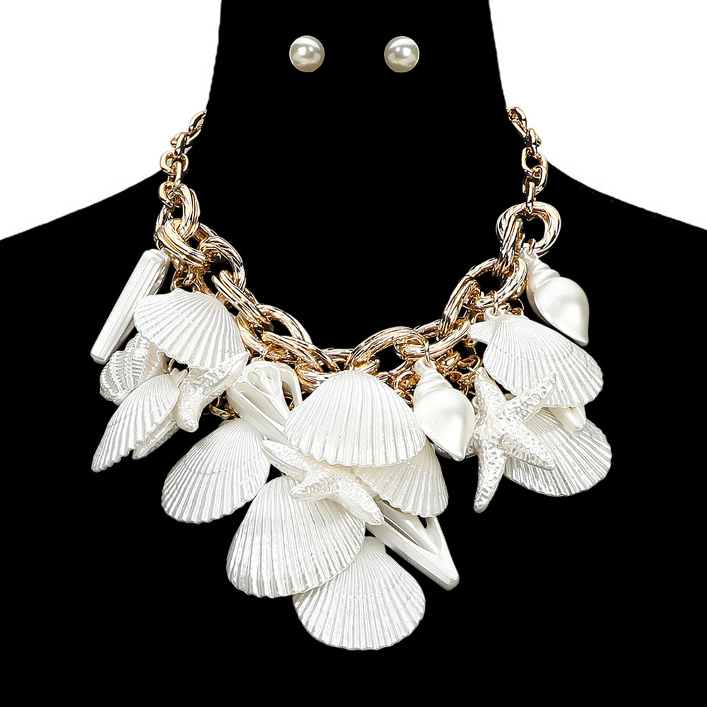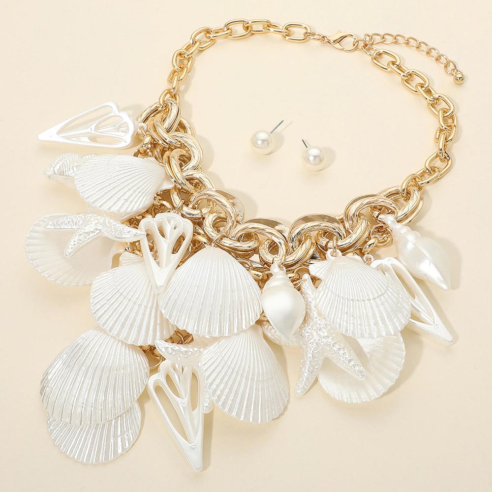 Details • Necklace Size : 19" + 2.5" L • Decor Size : 6" L • Earrings Size : 0.4" L • Bold sealife charm chain necklace paired with coordinating stud earrings, designed to create a standout layered look in one complete set. Featuring multiple dangling charms for added movement and dimension, this jewelry set is ideal for boutiques seeking eye-catching statement accessories with versatile styling appeal. • Lead and Nickel Compliant