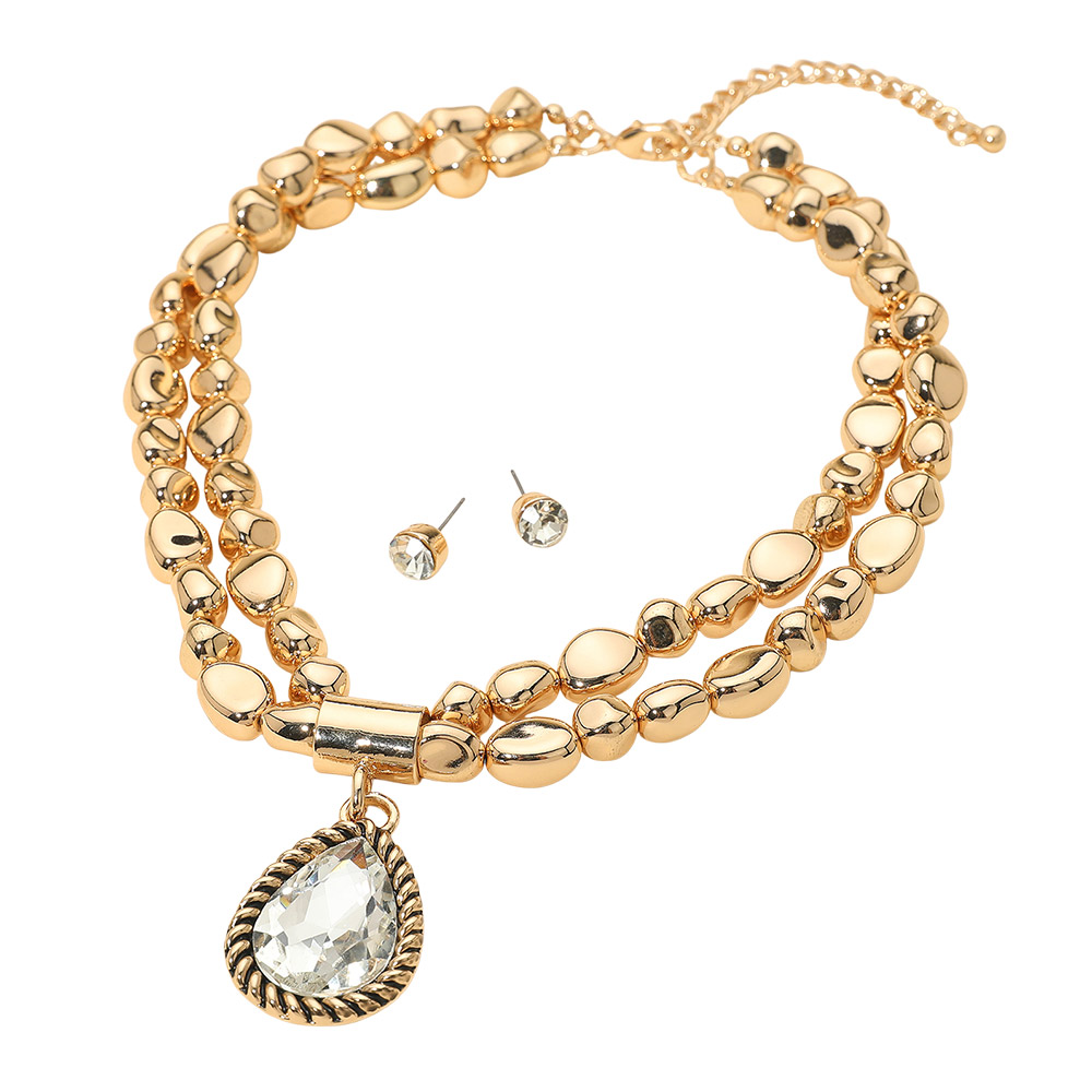 Bold Teardrop Pendant Metal Pebble Beaded Double Layered Statement Necklace