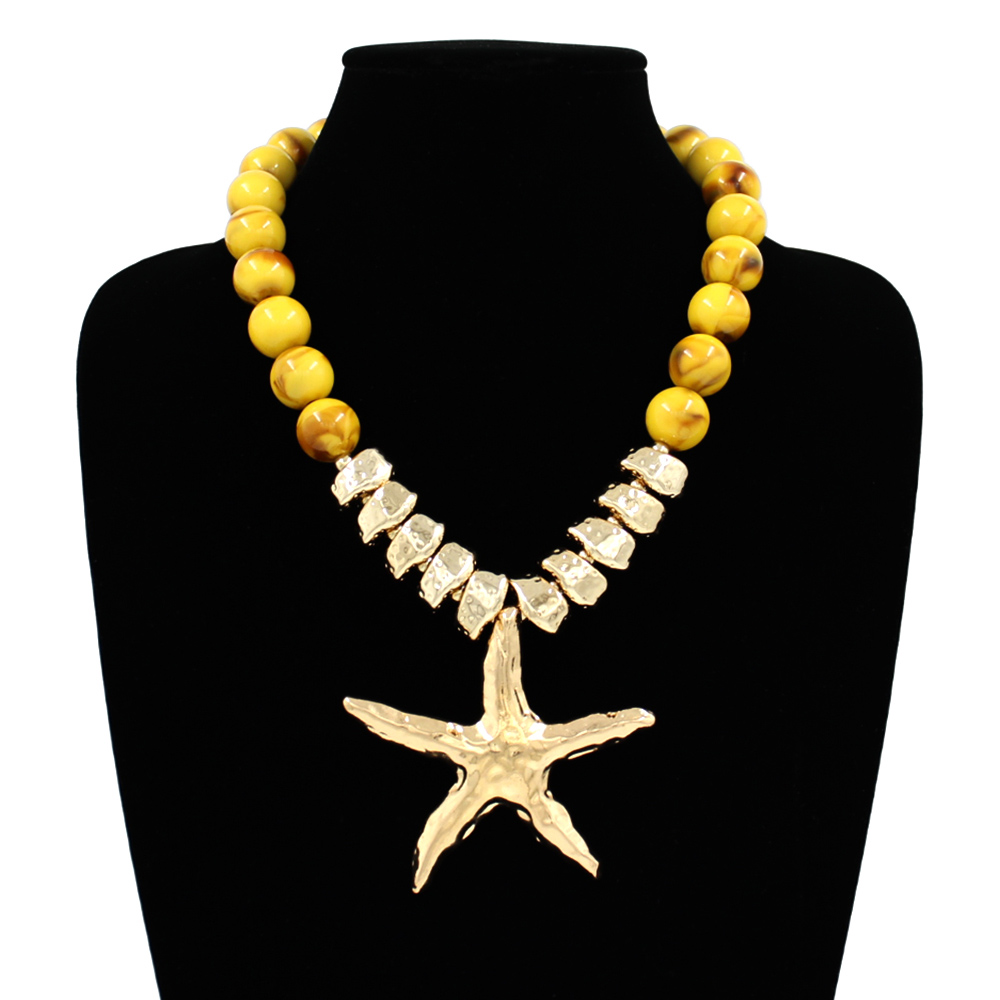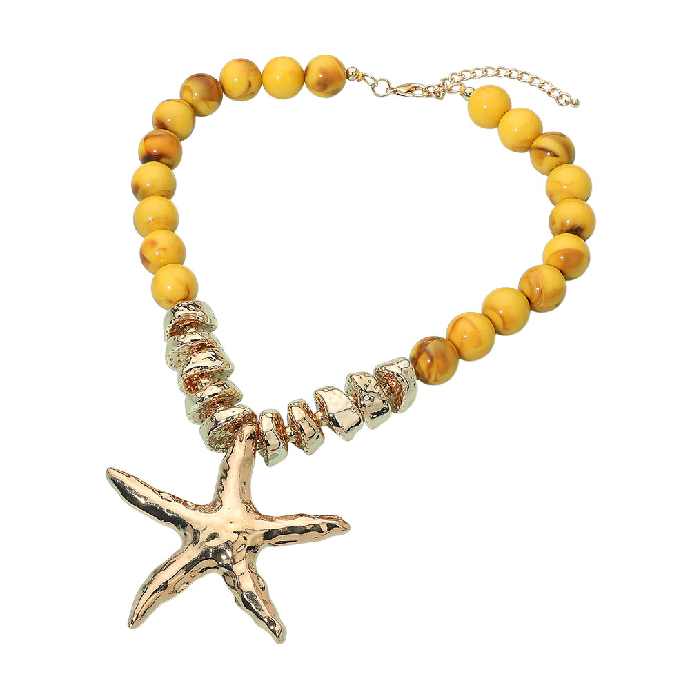 Details • Necklace Size : 22" + 3" L • Pendant Size : 3.25" X 3" • Bold beaded necklace featuring a sculpted starfish pendant and textured spacer accents for a coastal-inspired statement look. Perfect for vacations, beach outings, summer events or adding playful ocean-themed charm to everyday outfits with eye-catching style. • Lead and Nickel Compliant