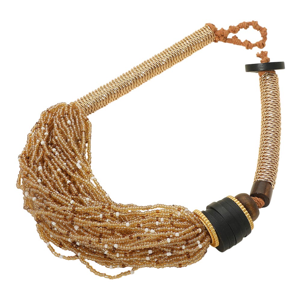 Bold Wooden Disc Accent Seed Beaded Multi Layered Statement Necklace Bold Wooden Disc Accent Seed Beaded Multi Layered Statement Necklace