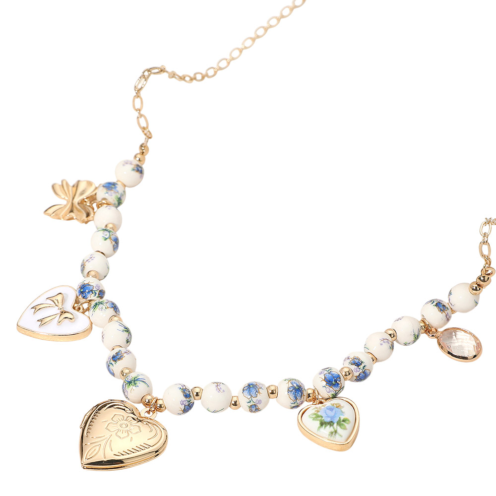 Details • Necklace Size : 16" + 3.5" L • Decor Size : 1" L • This beaded heart charm necklace blends vintage-inspired detailing with modern elegance. Featuring a mix of intricate charms and smooth beads, it brings a romantic and artistic touch to any outfit, making it a timeless accessory for both casual and dressy occasions. • Lead and Nickel Compliant