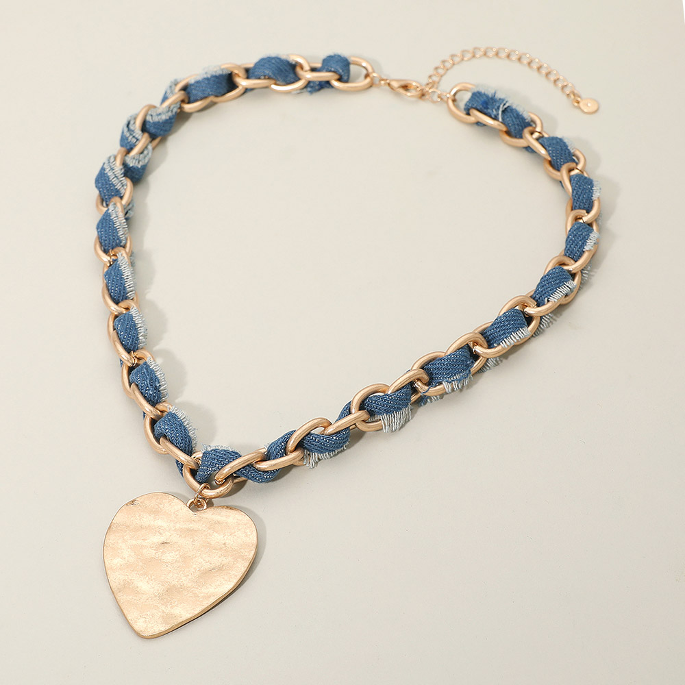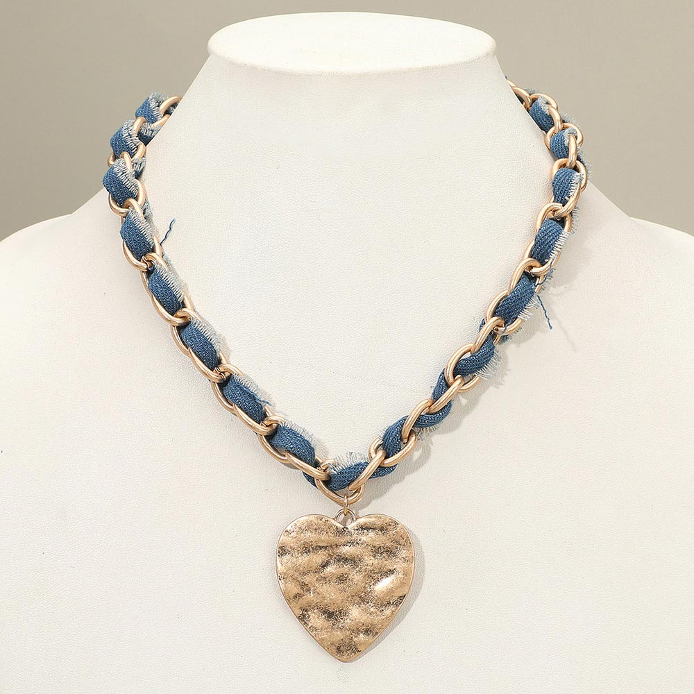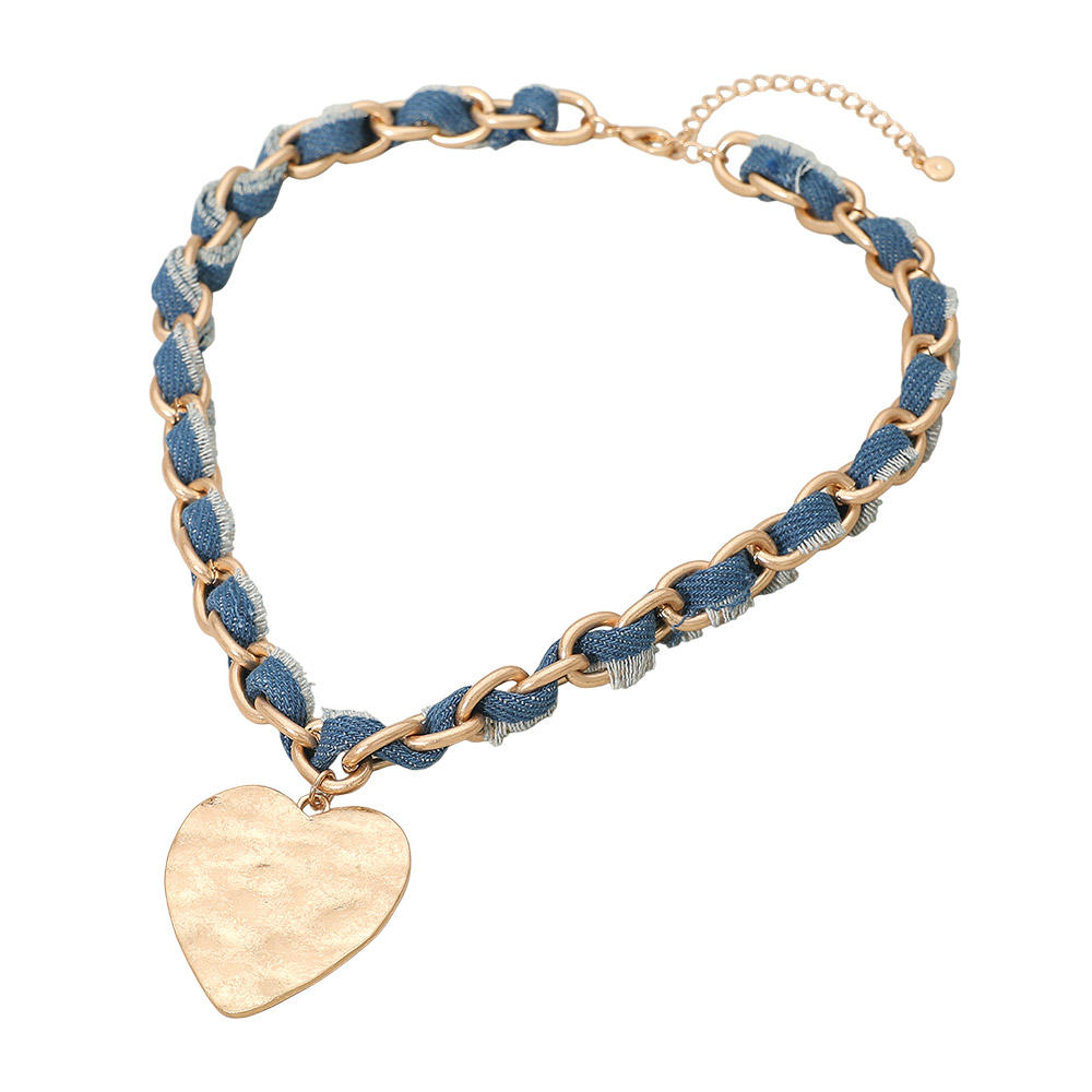 Details • Necklace Size : 18" + 3" L • Decor Size : 2.3" L • Statement necklace featuring a denim-woven chain and a textured heart pendant. Adjustable length design offers a bold yet casual accent for everyday outfits. A stylish accessory that adds personality and charm to any look. • Lead and Nickel Compliant