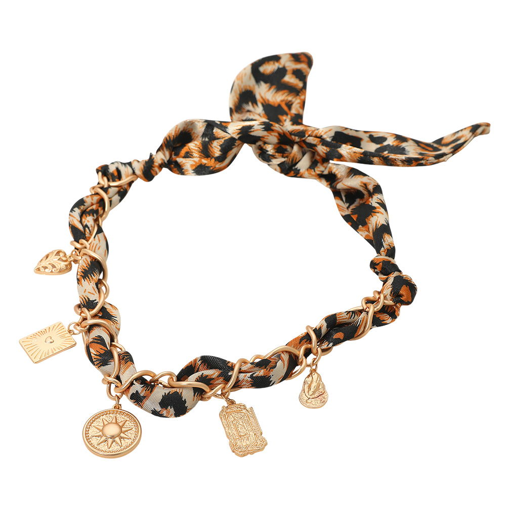 Details • Necklace Size : 29" L • Decor Size : 1.2" L • Adjustable • Make a stylish statement with this charm chain necklace featuring a patterned fabric accent intertwined through golden links. Decorated with symbolic pendants, it offers a perfect mix of bold elegance and modern flair, ideal for day or evening wear. • Lead and Nickel Compliant