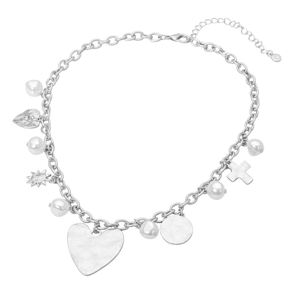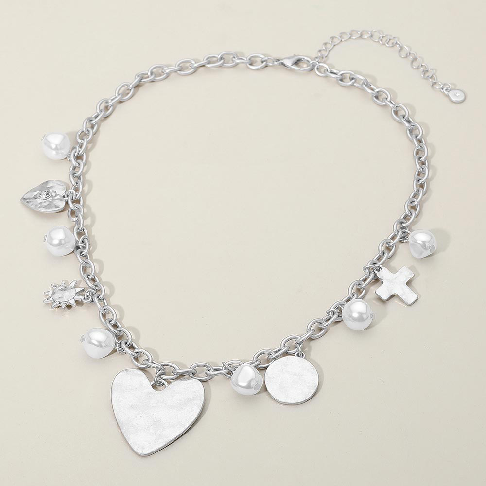 Brushed Metal Heart Cross Pearl Charm Station Chunky Necklace