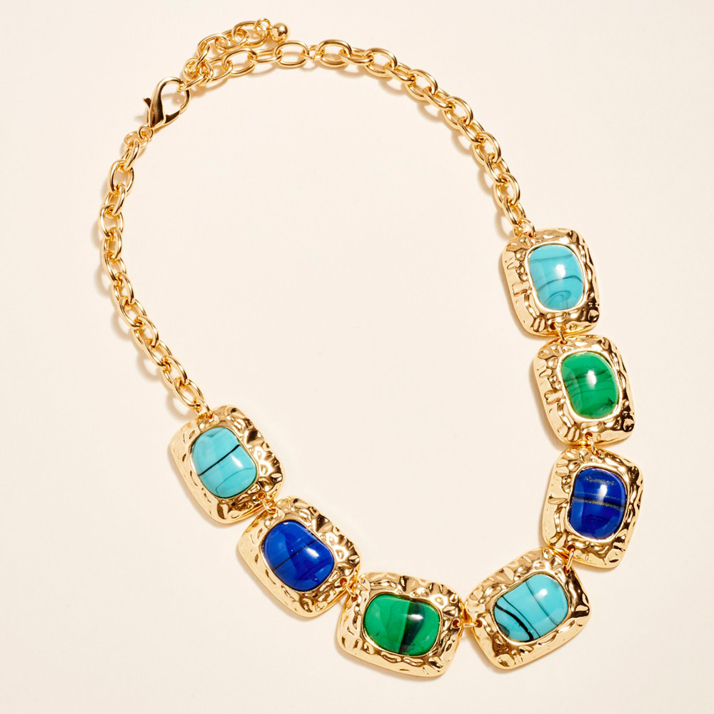 • This statement chain necklace features bold cabochon-style accent links set along a classic chain for a striking, fashion-forward look. Designed with an adjustable length for versatile styling, it sits beautifully as a standalone piece or layered with other favorites. Perfect for elevating everyday outfits, vacation looks, or dress-ready ensembles with modern charm and eye-catching detail.