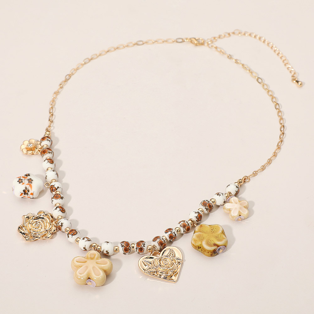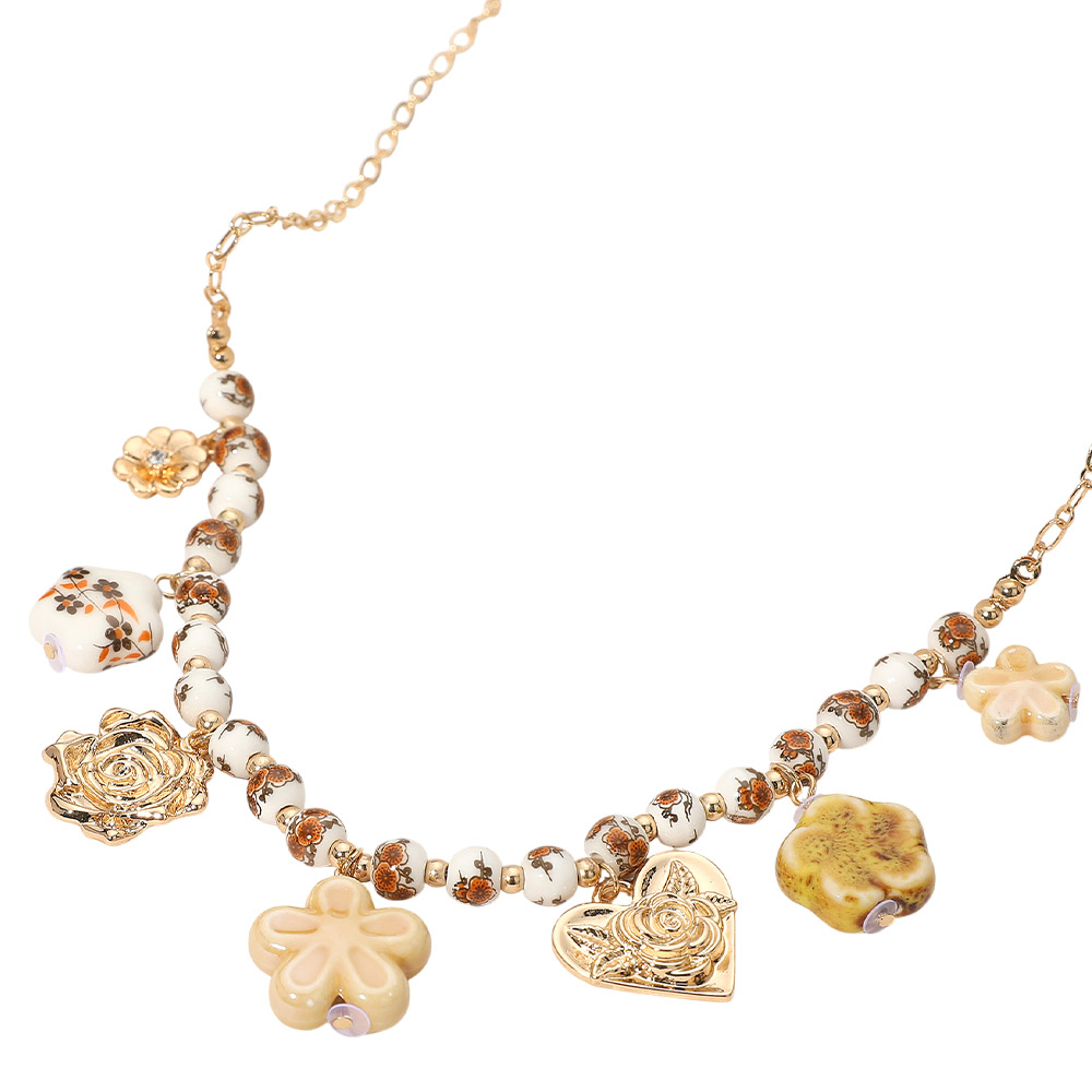 Details • Necklace Size : 16" + 3.5" L • Decor Size : 1" L • This beaded charm necklace showcases a delightful mix of floral and heart-shaped accents for a playful, feminine touch. The intricate beadwork and sculpted charms add artistic detail, making it an eye-catching accessory that complements both modern and boho-inspired looks. • Lead and Nickel Compliant