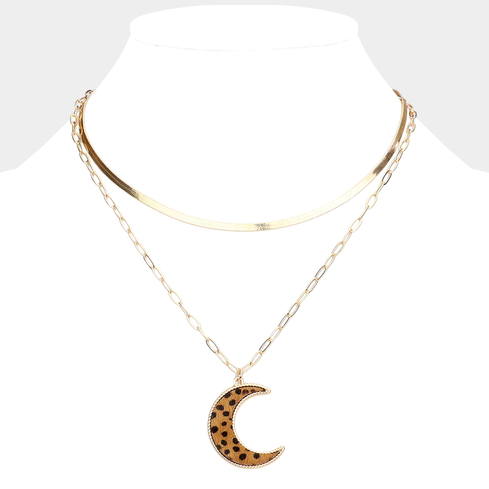 Cheetah Patterned Genuine Leather Crescent Moon Pendant Double Layered Necklace