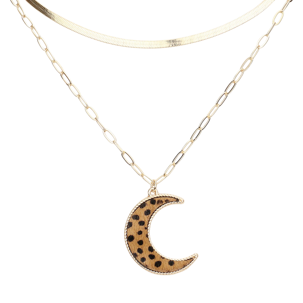 Leopard Patterned Genuine Leather Crescent Moon Pendant Double Layered Necklace