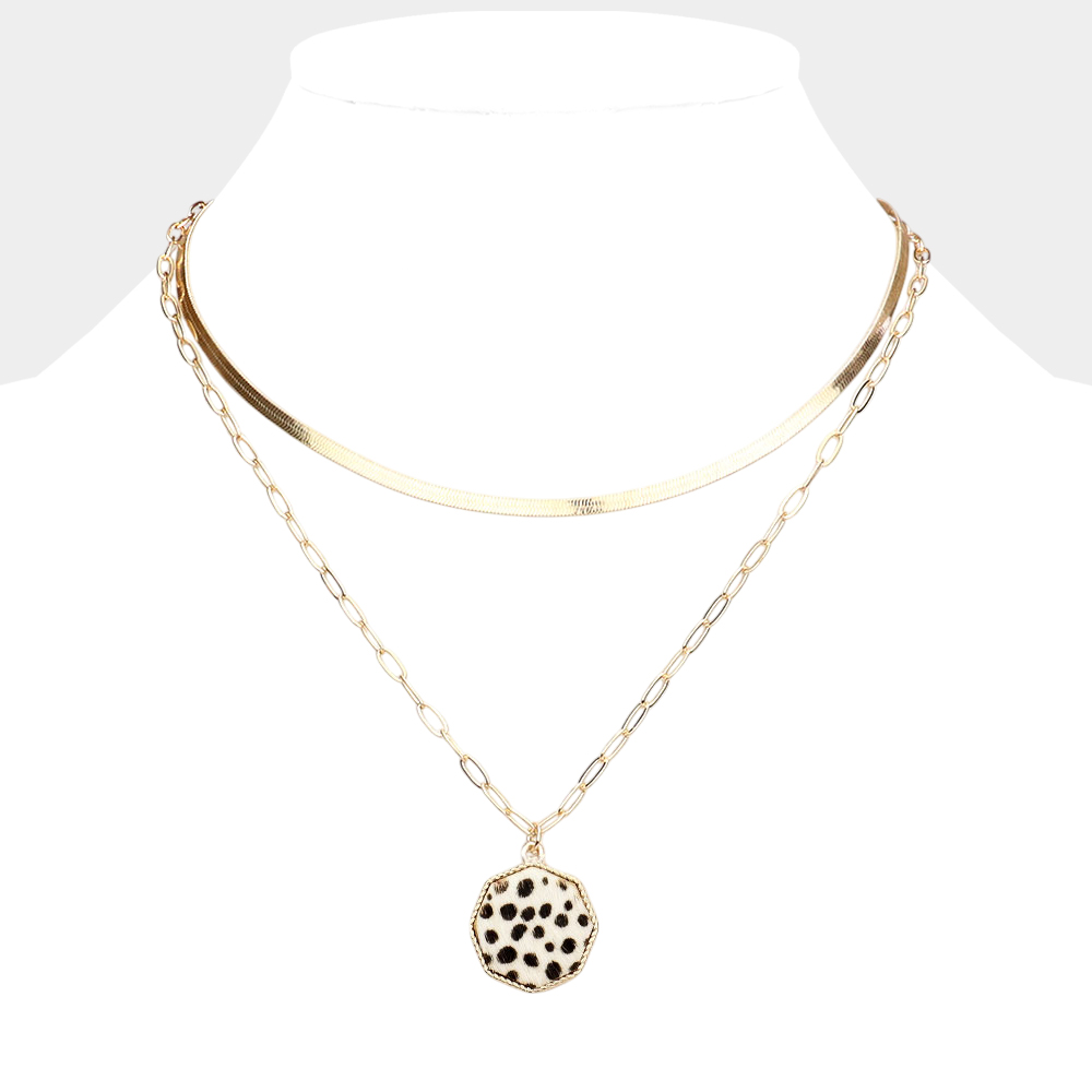 Cheetah Patterned Genuine Leather Angled Pendant Double Layered Necklace