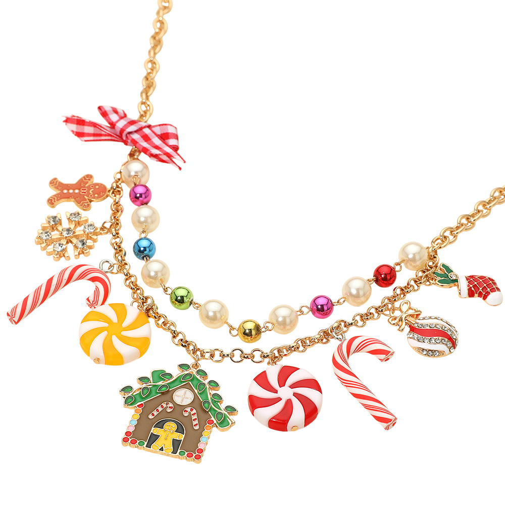Details • Necklace Size : 16" + 3.5" L • Decor Size : 3" L • Add a touch of holiday cheer with this Christmas candy charm necklace featuring playful pendants like peppermint swirls, candy canes, and a gingerbread house. Fun, festive, and eye-catching, it’s the perfect statement accessory for holiday parties or joyful celebrations. • Lead and Nickel Compliant