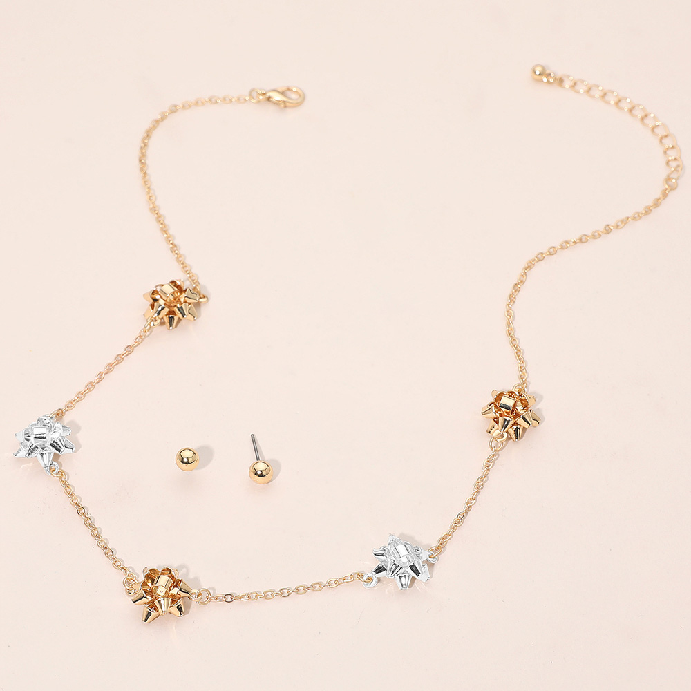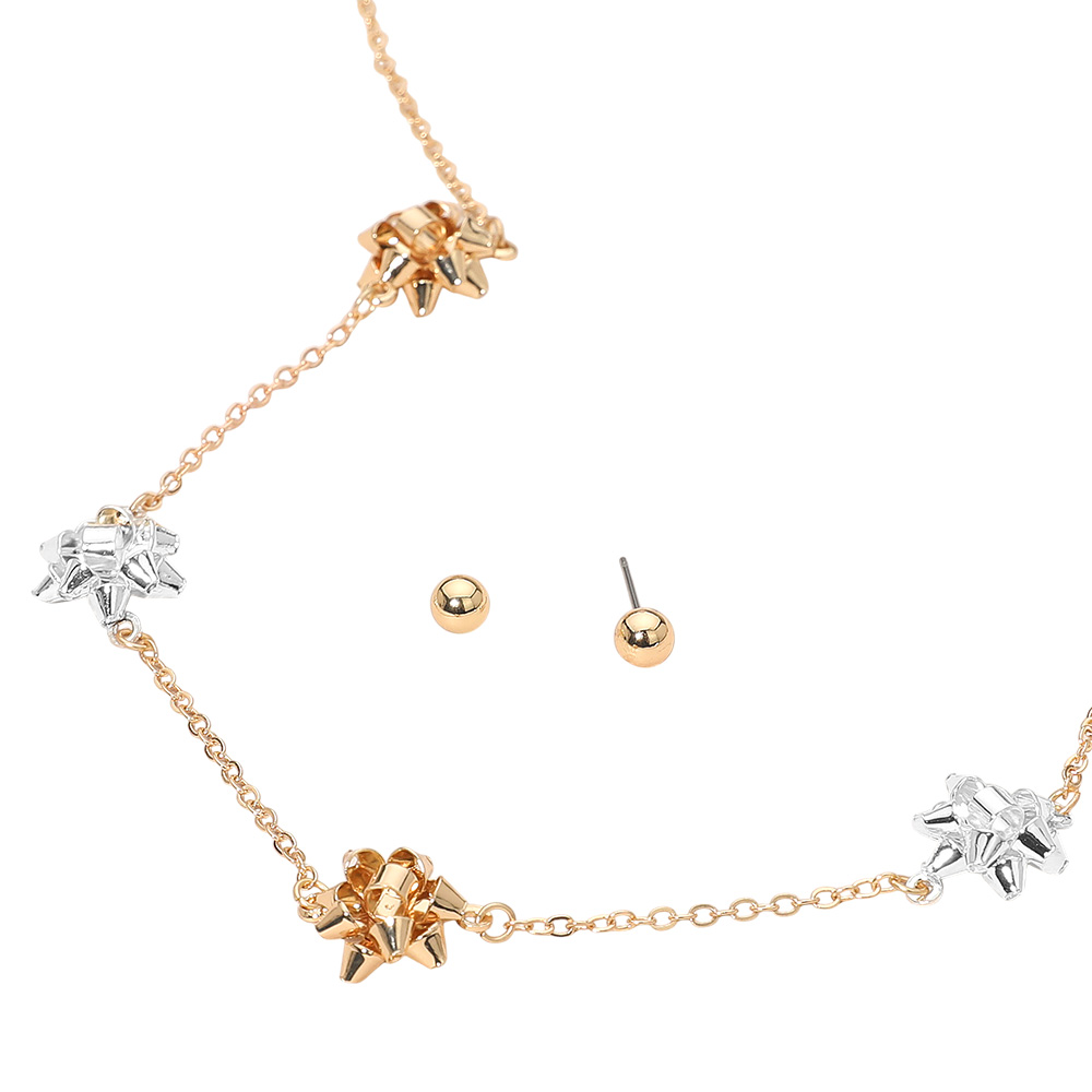 Details • Size : 17" + 2.5" L • Decor Size : 0.5" L • Earrings Size : 0.2" L • Charming necklace and earring set featuring bow-shaped accents for a fun and festive look. Perfect for celebrations, parties, or seasonal gatherings, this playful jewelry set adds a cheerful touch to your outfit while maintaining a stylish and coordinated appeal. • Lead and Nickel Compliant
