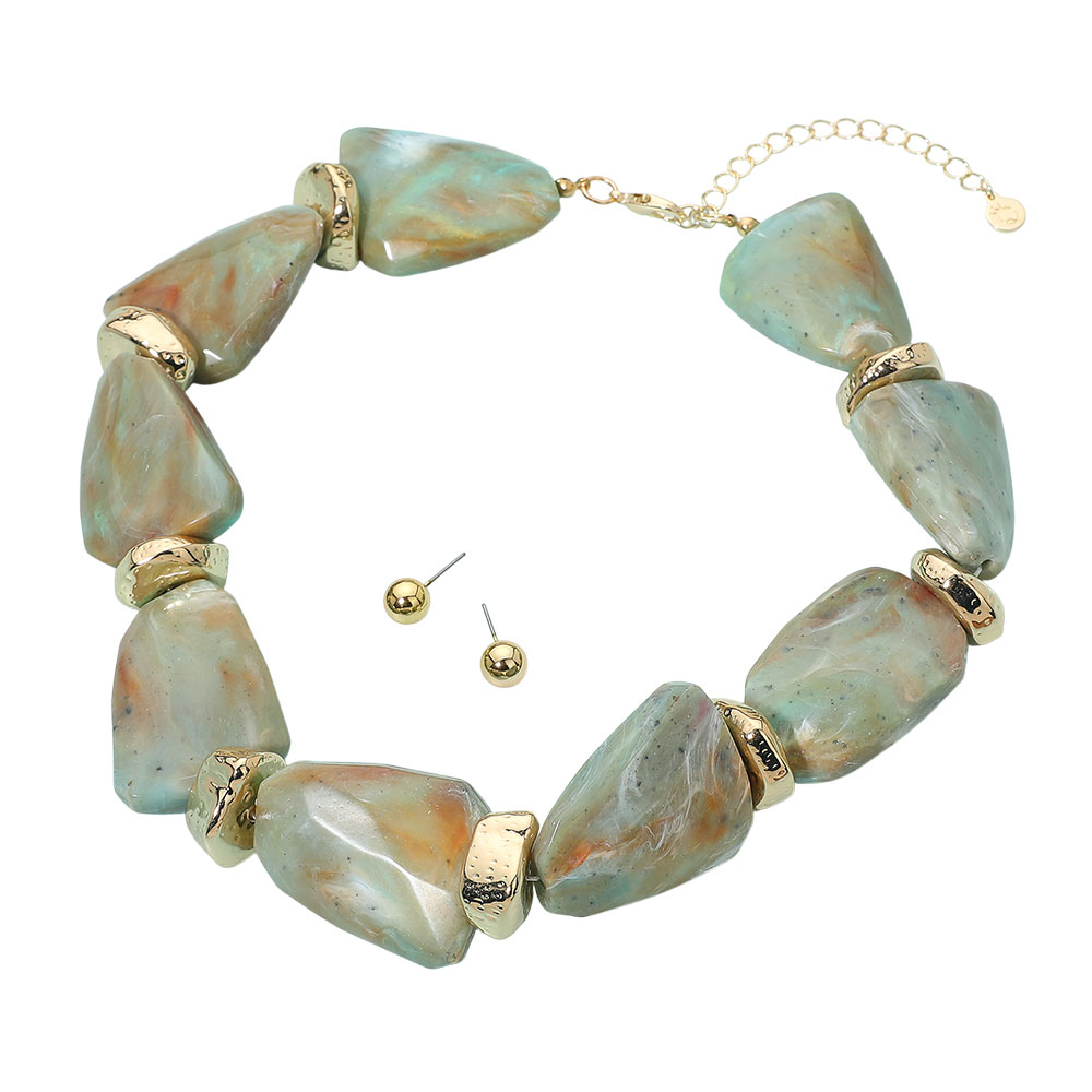 • Make a striking impression with a chunky stone necklace set featuring oversized natural-shaped beads and matching stud earrings. Perfect for special occasions or elevating everyday looks, this bold accessory combines earthy elegance with contemporary flair.